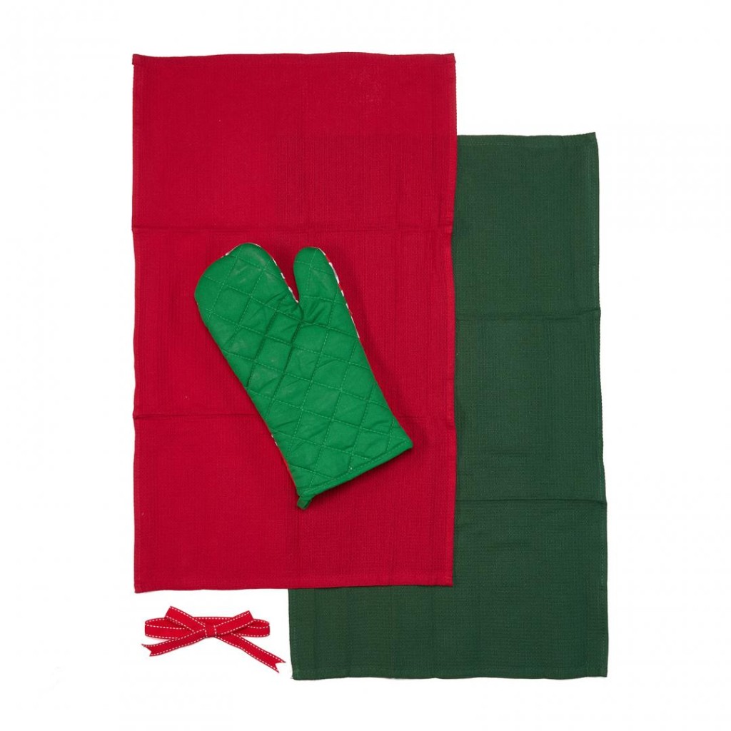 The set contains a kitchen glove 18×28 cm (polyester) and 2 kitchen towels size 38×64 cm, 100% Cotton, 60gr / piece. Various models