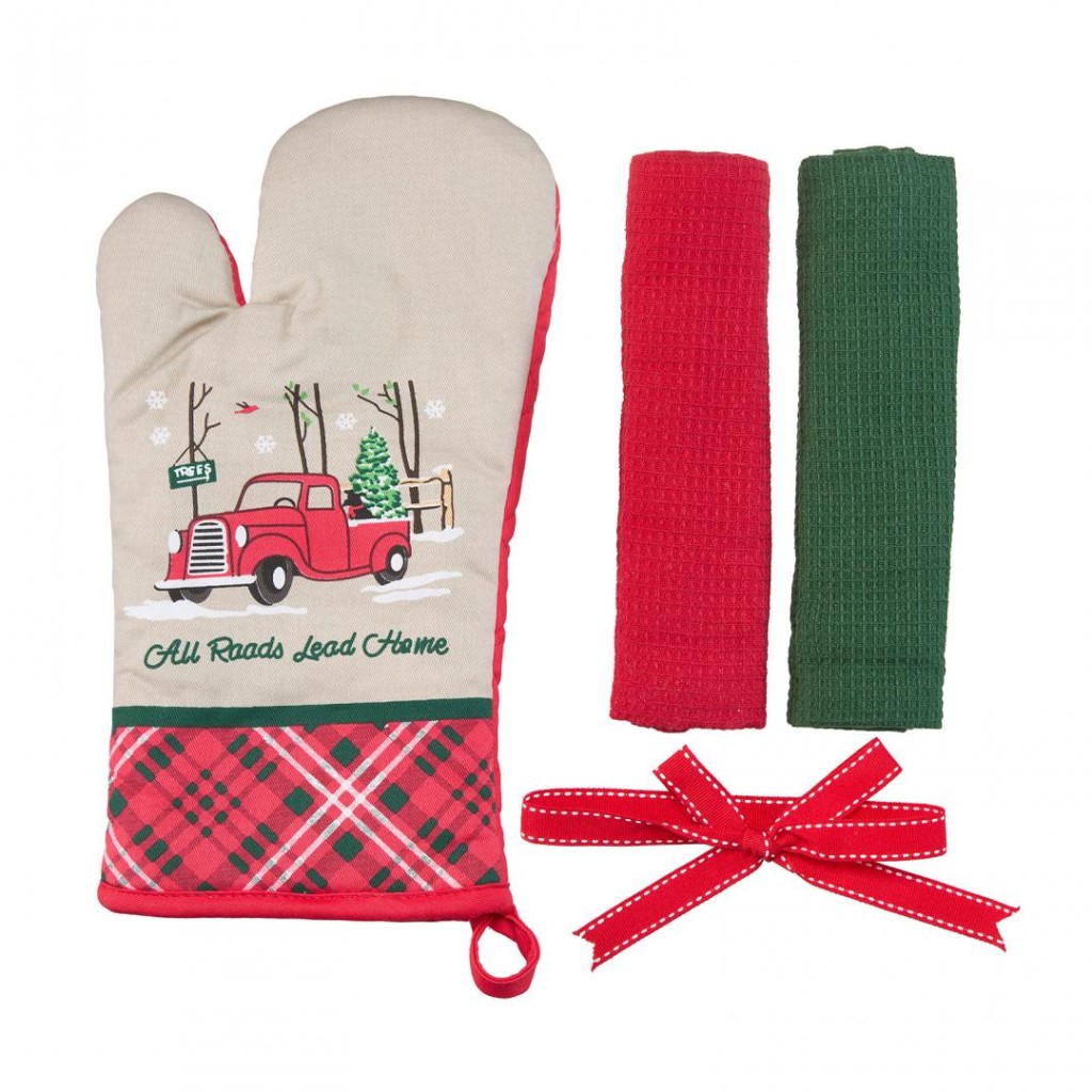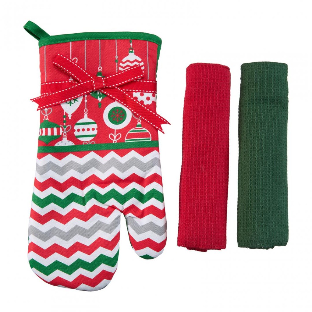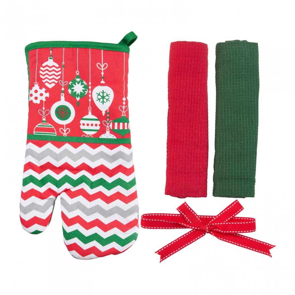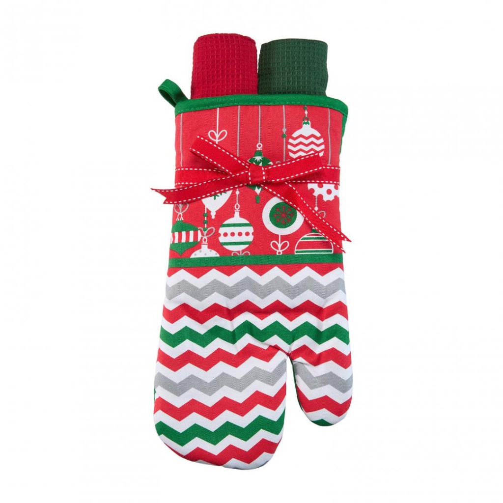 The set contains a kitchen glove 18×28 cm (polyester) and 2 kitchen towels size 38×64 cm, 100% Cotton, 60gr / piece. Various models