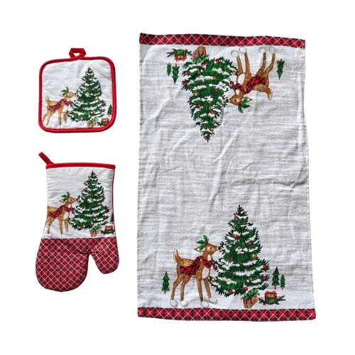 The set contains: a 17×17 cm pot holder, a 38×63 cm towel, a 17×27 cm oven glove