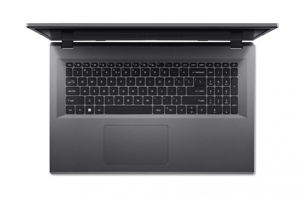 Laptop Acer Acer Aspire Go 17 AG17-31P, 17.3 inches (43.94 cm), Acer ComfyView™ Full HD IPS Display with LED-Backlight (non-glare), 1920 x 1080, 16:9, Intel® Core™ 3 processor N355, 1.9 GHz base clock (Up to 3.9 GHz max. performance clock rate), 6 MB Intel® Smart Cache, video, RAM 16 GB LPDDR5 RAM, SSD 512 GB PCIe Gen4 NVMe Solid-State-Drive (SSD), no ODD, No Card reader, 1x 3.5 mm speaker/headphone/line-out (supports headsets with integrated microphone), HD Webcam, No LAN, WLAN Intel® Dual Band Wireless-AX, Wi-Fi 6 (802.11a/b/g/n/ac+ax), Bluetooth® 5.2, No Fingerprint reader, 1x HDMI® 2.1, 1x DisplayPort™ via USB Type-C, 4xUSB 3.2 (2x Type-A Gen 1 ; 2x Type-C Gen. 2), USB Type-C 65W power adapter (50% PCR-plastic), Li-Ion battery (3 cells / 53 Wh), Acer FineTip keyboard (99-/100-/103-keys), US International (QWERTY), Steel Gray, Weight 2,035 kg, Dimensions 402.1 x 258.5 x 21.4 mm (W x D x H), No OS (Boot-up only)