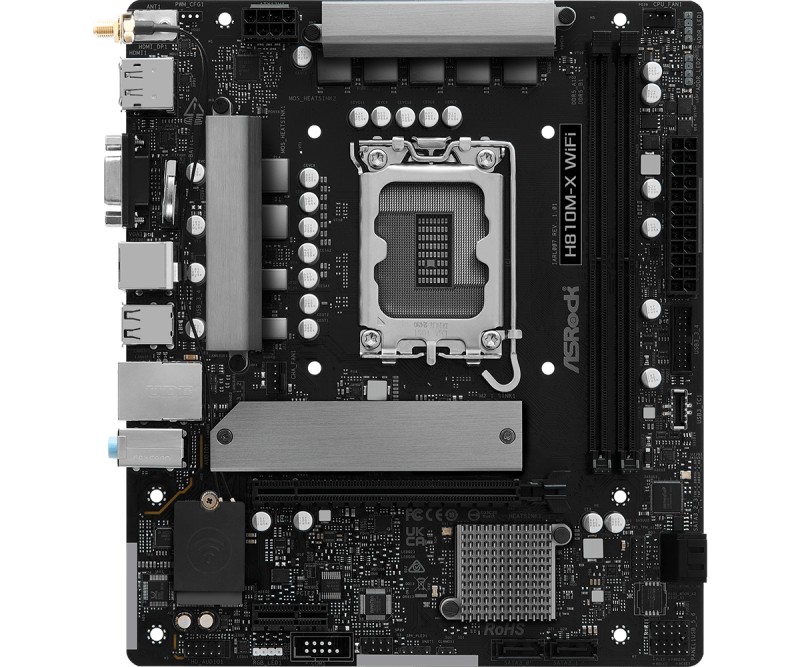 Asrock H810M-X WiFi. Processor manufacturer: Intel, Processor socket: LGA 1851 (Socket V1), Compatible processor series: Intel Core Ultra (Series 2). Supported memory types: DDR5-SDRAM, Maximum internal memory: 128 GB, Memory slots type: DIMM. Supported storage drive interfaces: M.2, SATA III, Supported storage drive types: HDD & SSD. Ethernet interface type: 2.5 Gigabit Ethernet, LAN controller: Dragon RTL8125BG, Top Wi-Fi standard: Wi-Fi 5 (802.11ac). Component for: PC, Motherboard form factor: micro ATX, Motherboard chipset family: Intel