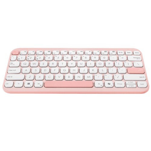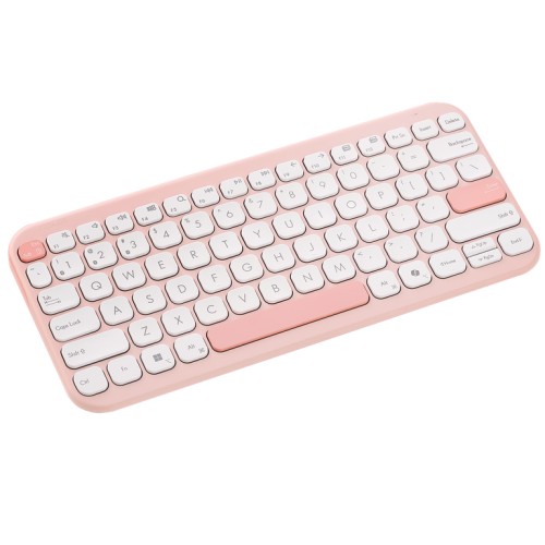 ASUS Marshmallow KW100 wireless keyboard, Bluetooth 5.0, multi-device (3 devices), scissor keys 1.6 mm travel, 2-level kickstand, 2×AAA battery life up to ~24 months, dimensions 282×130×18.4 mm, weight 374.8 g, compatible with Windows, ChromeOS, macOS, iOS, iPadOS