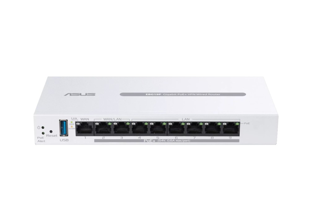 ASUS WIRED ROUTER 8 POE ports EBG19P, Wireless standards: Bluetooth® 3.0, Bluetooth® 3.2, IEEE 802.1p, IEEE 802.1q, IEEE 802.3, IEEE 802.3ab, IEEE 802.3i, IEEE 802.3u, IEEE 802.3x, IPv4, IPv6, 1 x internal Bluetooth antenna, Processor: 1.8GHz Dual-core ARMv8, Memory: 256 MB Flash, 512 MB RAM, Interface: 1 x WAN, 8 x LAN Gigabit, 1 x USB 3.2, Dimensions: 212x95x26 mm, weight: 530g,