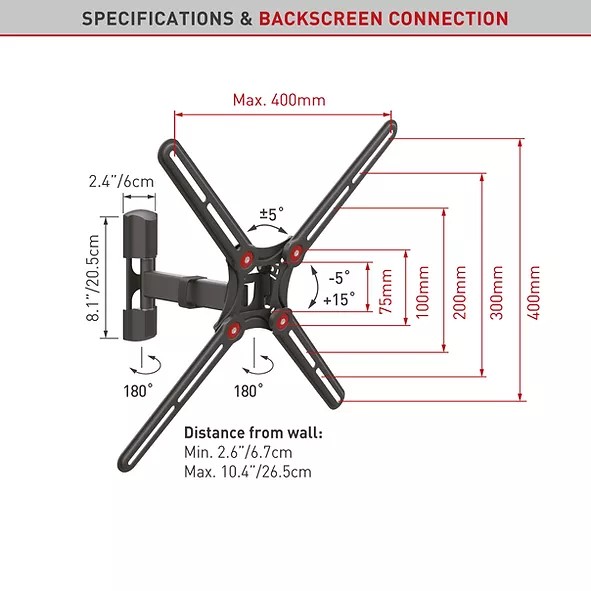 Barkan TV Wall Mount Full Motion 13″-65″ Functions Full Motion – Rotate, Swivel & Tilt Max TV size 13″ – 65″/ 33 – 165cm Max TV weight 88lbs/ 40kg TV VESA up to 400x400mm TV type Flat TV, Curved TV https://www.barkanmounts.com/products/TV-Mounts/BM331