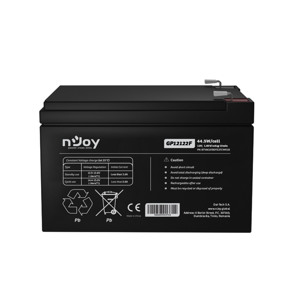 BATTERY NJOY GP12122F 12V, 44W/cell, Copper, internal resistance 17 ohm, terminals F2 (T2), Pb-acid AGM technology