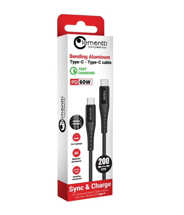 Cablu Lemontti Bending Aluminum Type-C la Type-C, Fast Charge, PD 60W, 2m, Negru