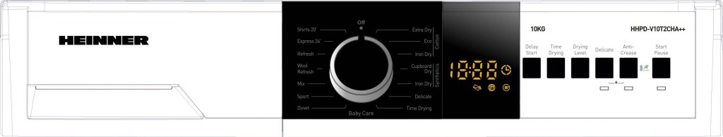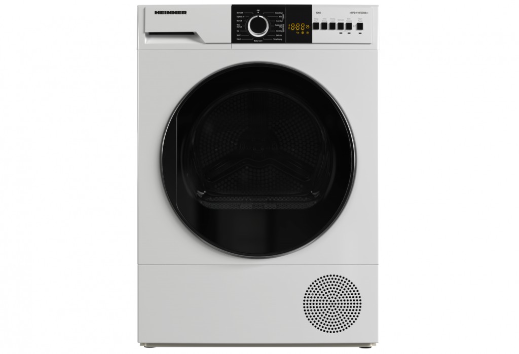 Clothes dryer with heat pump Heinner HHPD-V10T2CHA++, Load capacity 10kg, Energy class A++, 15 drying programs, LED display, Quick shirt program 20 min, Express program 34 min, Baby Care program, Delayed start function, Anti- siphoning, Tub light, Drying level selector, Lint filter cleaning indicator, Water collection tank full indicator, Child lock, Dimensions (WxHxD): 59.6×63.9×84.5 cm, Color: White