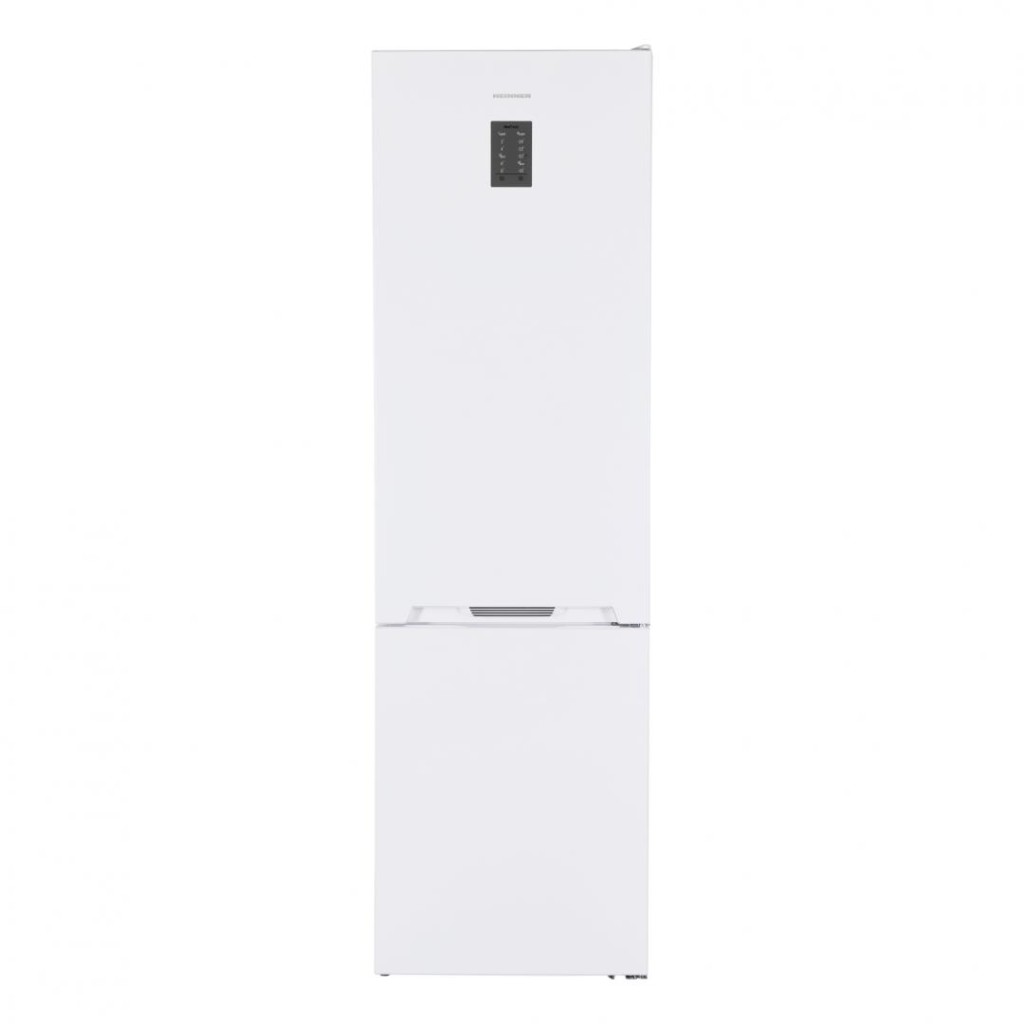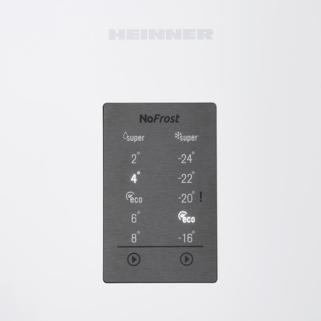 Heinner refrigerator HCNF-V366E++, No Frost Multicooling, energy class E, total capacity: 366 L, refrigerator capacity: 265 L, Freezer capacity: 101 L, display on the door, electronic control, Freezer Shield technology, LED light, fast freezing function , open door alarm, Chiller drawer, fruit and vegetable compartment with humidity control, 3 refrigerator glass shelves, 3 freezer drawers, egg holder, ice cube tray, freezing capacity: 8kg/24h, dimensions (WxDxH): 59.5 x 65 x 201cm, color: white with chrome decoration on the handle