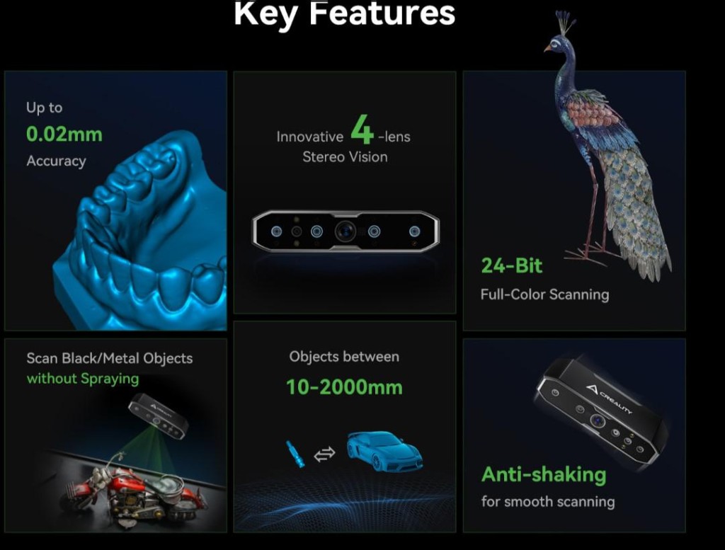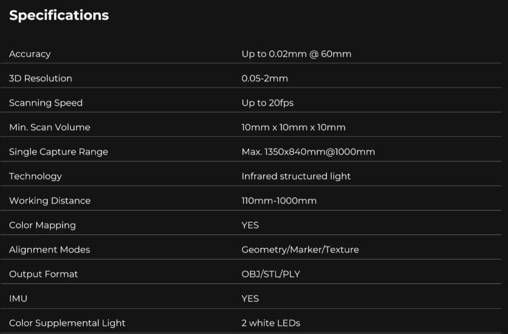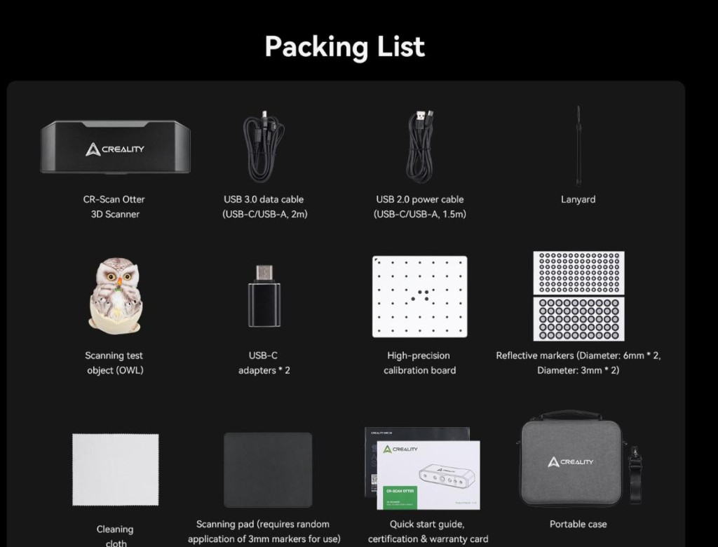 CREALITY 3D SCANNER CR-SCAN OTTER, Accuracy: up to 0.02mm, 3D resolution: 0.05-2mm, Scanning speed: 20fps, Power supply: 5V 3A, Weight: 390g, Color Mapping, IMU, Laser Class 1, Output format: OBJ/ STL/PLY, Interface: USB C/USB 2.0, Working distance: 110-1000mm, Minimum scanning volume: 10x10x10mm, Product dimensions: 165x37x59mm, marker recognition: 8 x infrared LED, alignment: Marker, Lighting: 2 x LED, technology: Infrared Structured Light, Single Capture coverage: 1350x840mm, Windows, Mac OS