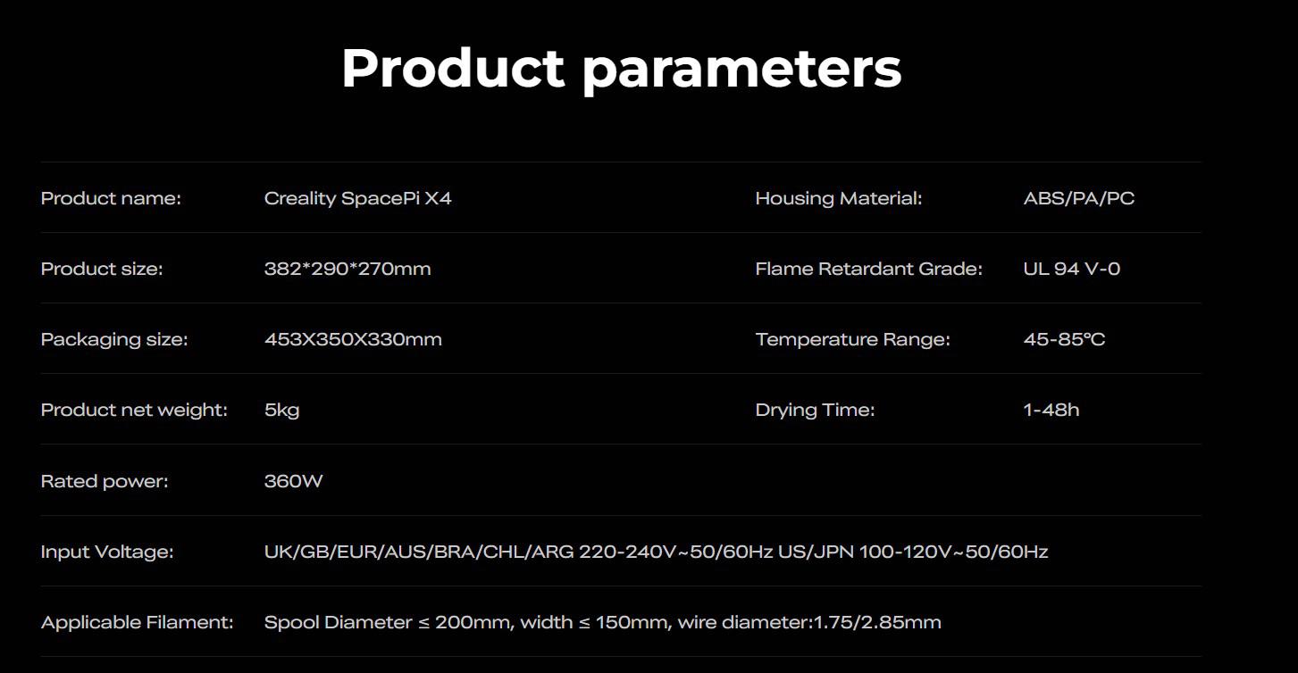 CREALITY 3D SPACE PI X4 FILAMENT DRYER, Capacity: 4 filament rolls, two independent chambers with independent temperature control, temperature: up to 85°C, active dehumidification, 3.2″ Touchscreen, Compatible with 1kg, 2kg filament rolls, 1.75mm and 2.85mm diameter.
