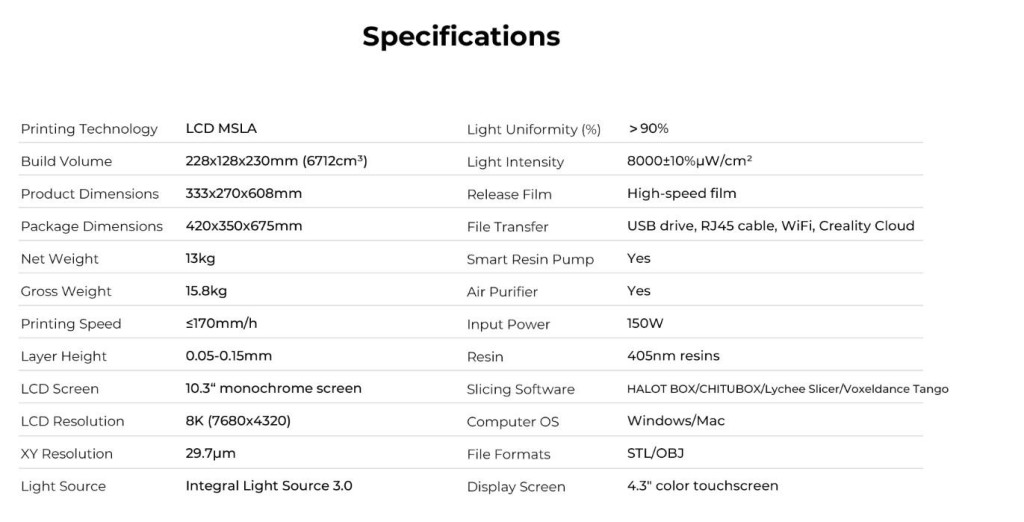 Creality Halot-MAGE PRO 3D printer with resin, SLA Technology, Stereolithography, 150W source, print dimensions: 228*128*230mm, Printer dimensions: 333*270*608mm, Speed: 170mm/h, Layer height: 0.05-0.15mm, LCD 10.3″, resolution: 8K(7680×4320), file transfer: USB drive, rj45, WIFI, Creality Cloud, resin: 405nm, Software: HALOT BOX, CHITUBOX, LycheeSlicer, File format: STL/OBJ, Package weight: 15.8kg, Package dimensions: 420*350*675mm.
