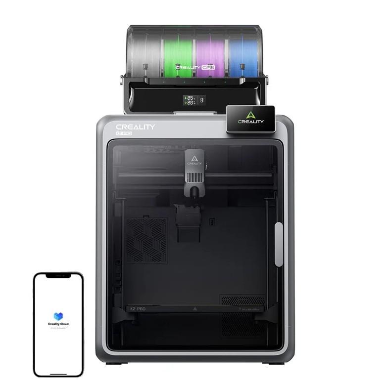 CREALITY K2 PRO Combo FDM 3D PRINTER, include un sistem CFS multi- filament, Suporta maxim 4 x CFS – 16 culori, Tehnologie: FDM, volum printare: 300 x 300 x 300mm, Dimensiuni produs: 445 × 477 × 573 mm, 23.7kg, Viteza printare: 600 mm/s, Accelerare: 20.000 mm/s, Temperatura duza max: 300 ° C, Motoare Step-Servo, Temperatura max platforma printare: 110 °C, Temperatura max incinta: 60 °C, Filamente compatibile; PLA/PETG/PET/ABS/ ASA/PLA-CF/PA-CF/PPA-CF, Filtru aer, Auto leveling, Camera incinta: 720P @30fps, RFID reader, Touchscreen 4″, Interfata: USB, WI-FI, LAN, port Creality 485, Spatiu stocare: 32GB EMMC, putere hot-end: 70W.