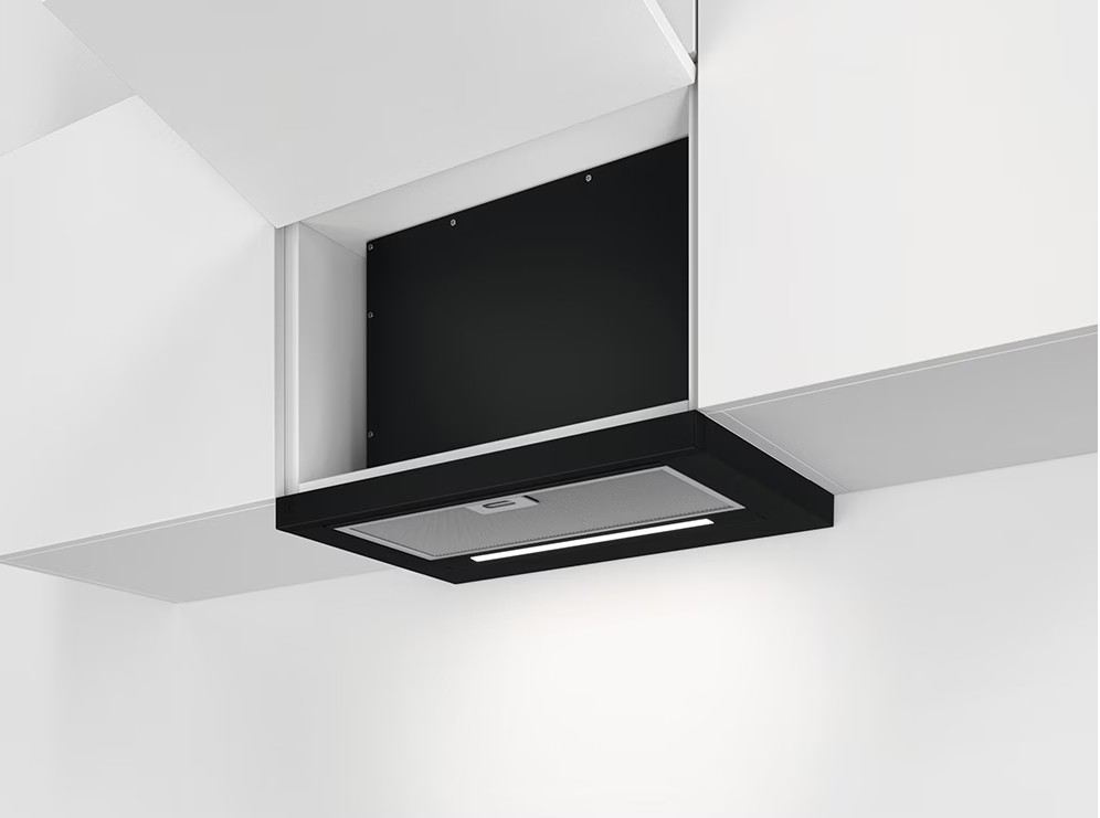 Telescopic built-in hood; Series 300; 60 cm; 1 motor; 3 speeds; 2 washable aluminum filters; Absorption power – 600 mc/h; Black