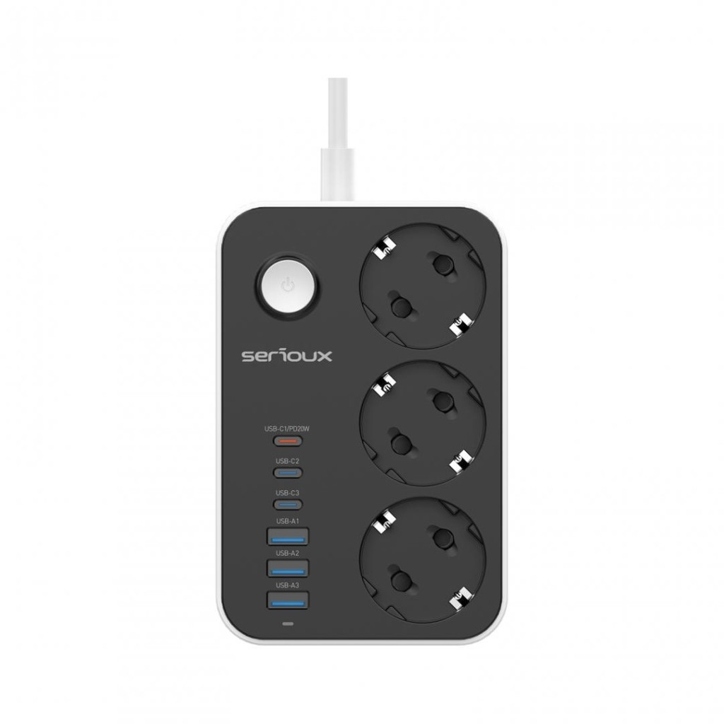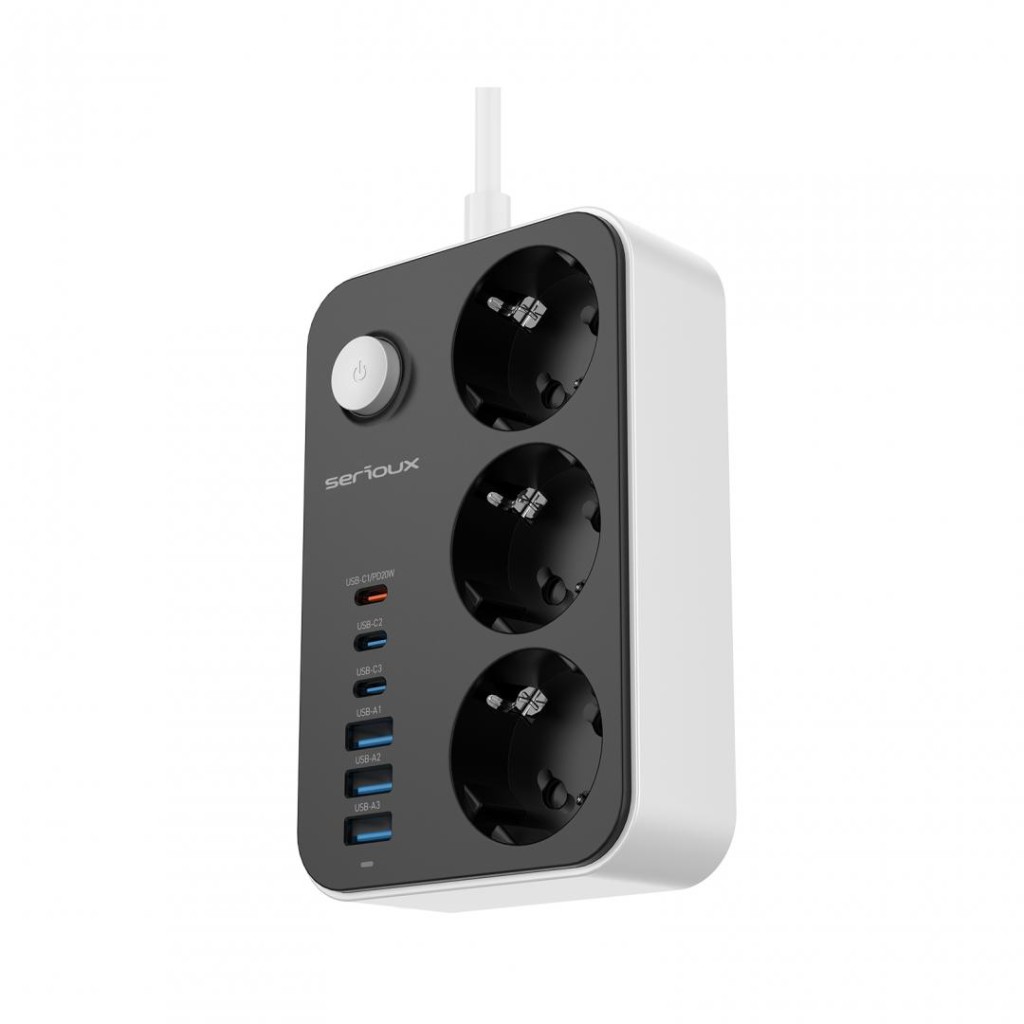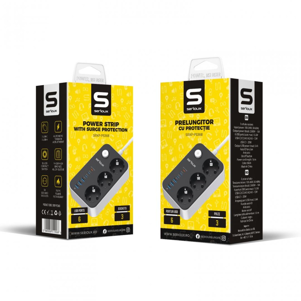 Extension Cord with protection Serioux, 3 sockets schuko, input 100-240V, 50- 60Hz, output (Total): 2500W – 10A, 6 ports USB, USB Output (Total):3.4A, auto ID function, antistatic, power/off button, cable length 1.6m,Black, SRXP-PS36B