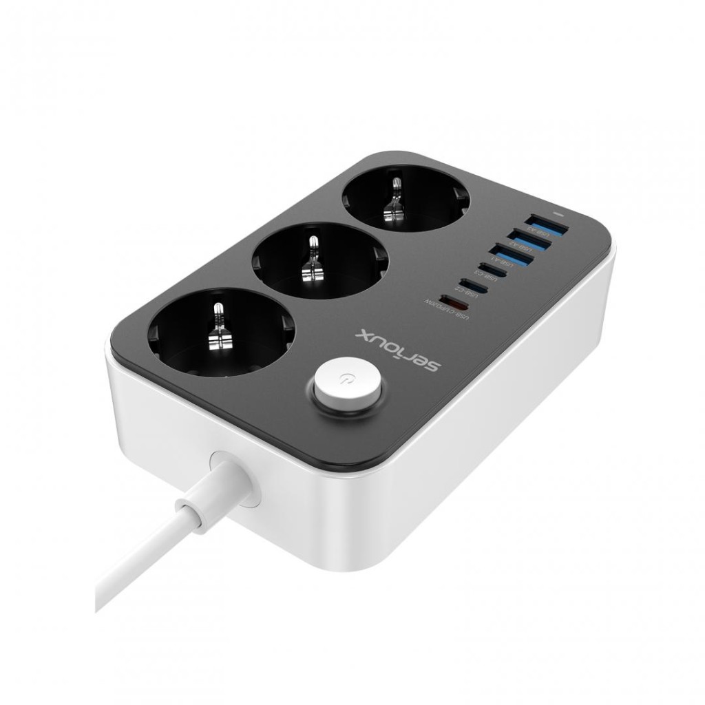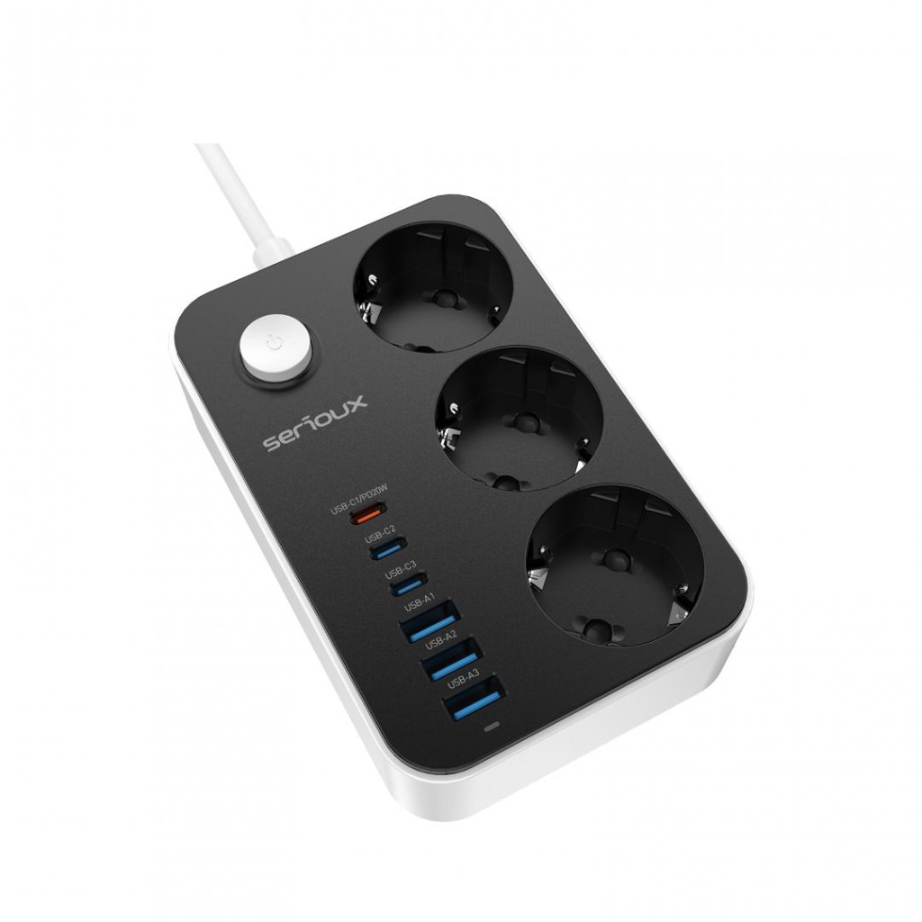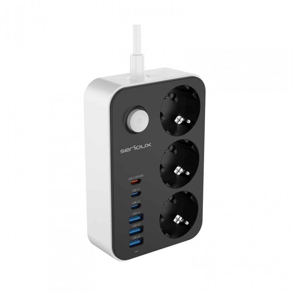 Extension Cord with protection Serioux, 3 sockets schuko, input 100-240V, 50- 60Hz, output (Total): 2500W – 10A, 6 ports USB, USB Output (Total):3.4A, auto ID function, antistatic, power/off button, cable length 1.6m,Black, SRXP-PS36B