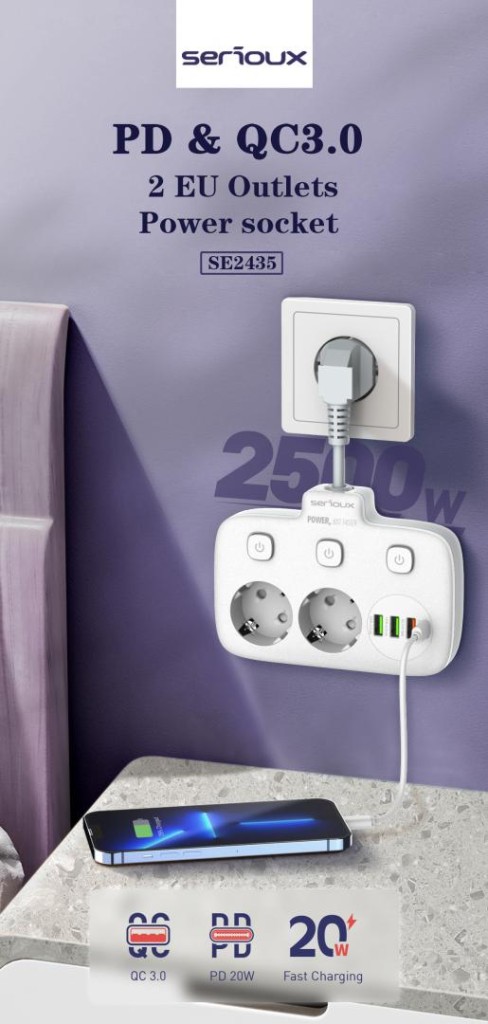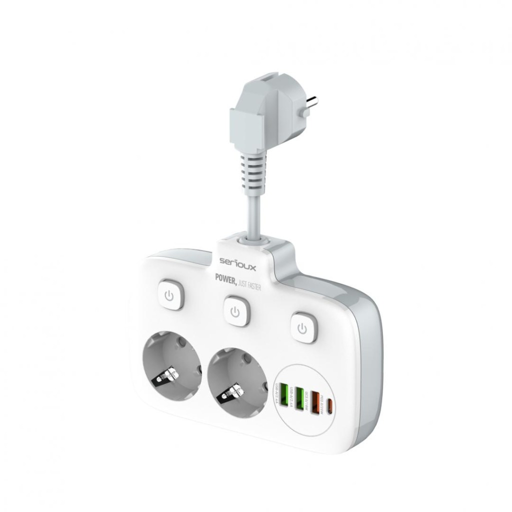 Socket extension with Serioux Quick Charge 3.0 protection, nominal parameters: 2500W-10A(Max) 250V, Input: AC100-250V 10A 50/60HZ, Output PD: 5V=3A 9V=2.22A 12V=1.67A 20W (MAX), QC Output: 5V-3A 9V=2A 12V=1.5A 18W (MAX) , Auto-ID Output: 5V-2.4A 12W (MAX) Total Power: 20W MAX