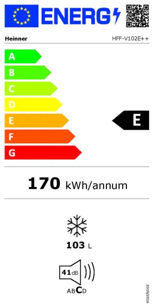Freezer Heinner HFF-V102E++, energy class: E, total capacity: 103L, mechanical control with adjustable thermostat, 3 freezer compartments, reversible door, freezing capacity: 5.2kg/ 24h, dimensions (WxDxH): 54 x 61.5 x 83.8 cm, color : White with chrome decoration on the handle