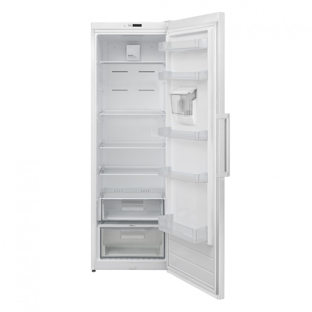 Heinner HF-V401NFWDE++ refrigerator, Full No Frost, water dispenser, energy class: F, total capacity: 389L, electronic control, LED light, Super cooling function, 4 glass shelves, fruit and vegetable compartment with humidity level control, Chiller compartment , egg holder, dimensions (WxDxH): 59.5 x 65 x 186 cm, color: White