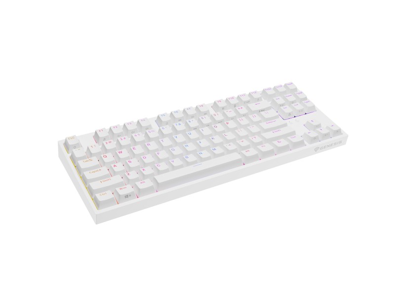 GENESIS Thor 404 TKL. Keyboard form factor: Tenkeyless (80 – 87%). Keyboard style: Straight. Connectivity technology: Wired, Device interface: USB, Keyboard key switch: Mechanical, Keyboard layout: QWERTY, Keyboard number of keys: 87. Backlight type: RGB LED. Cable length: 1.8 m. Recommended usage: Gaming. Product colour: White