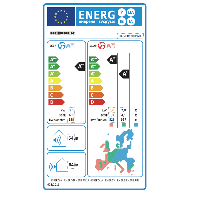 HEINNER Crystal HAC-CR12KITWIFI air conditioner, 12000BTU, WIFI control, installation kit included, energy class: cooling A++/heating A+, Follow me function, Turbo function, 8⁰C temperature maintenance function, high-density filter, self-cleaning, white