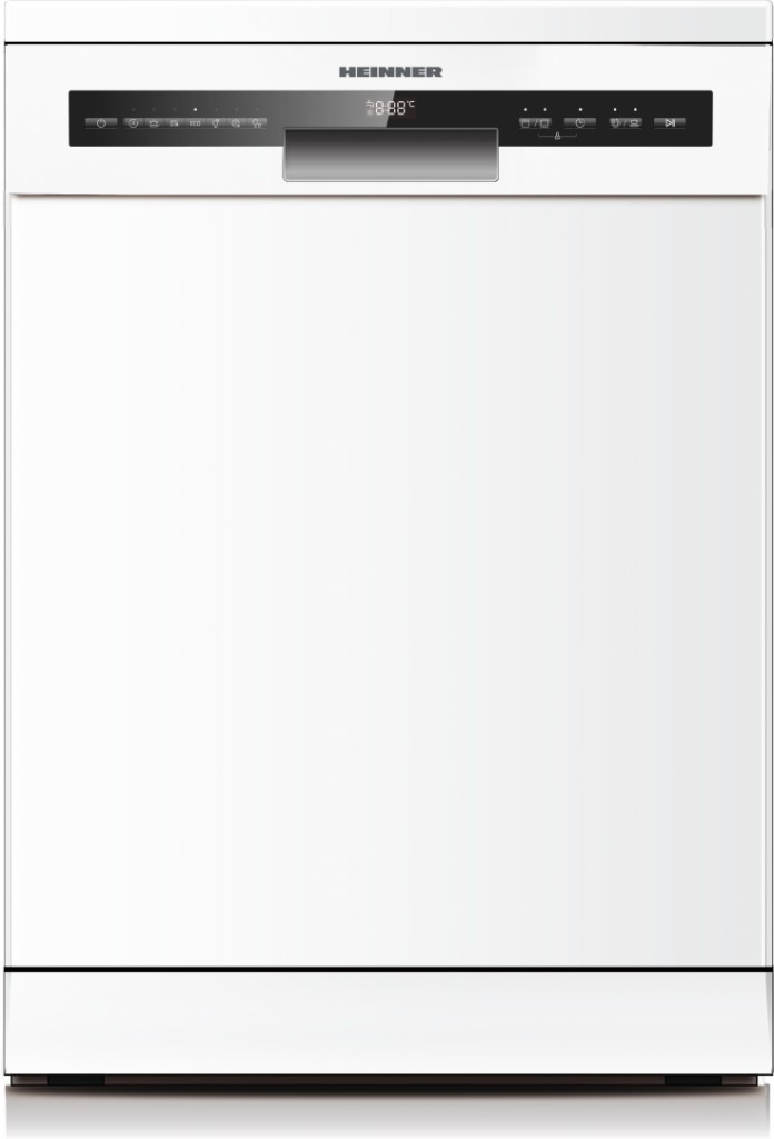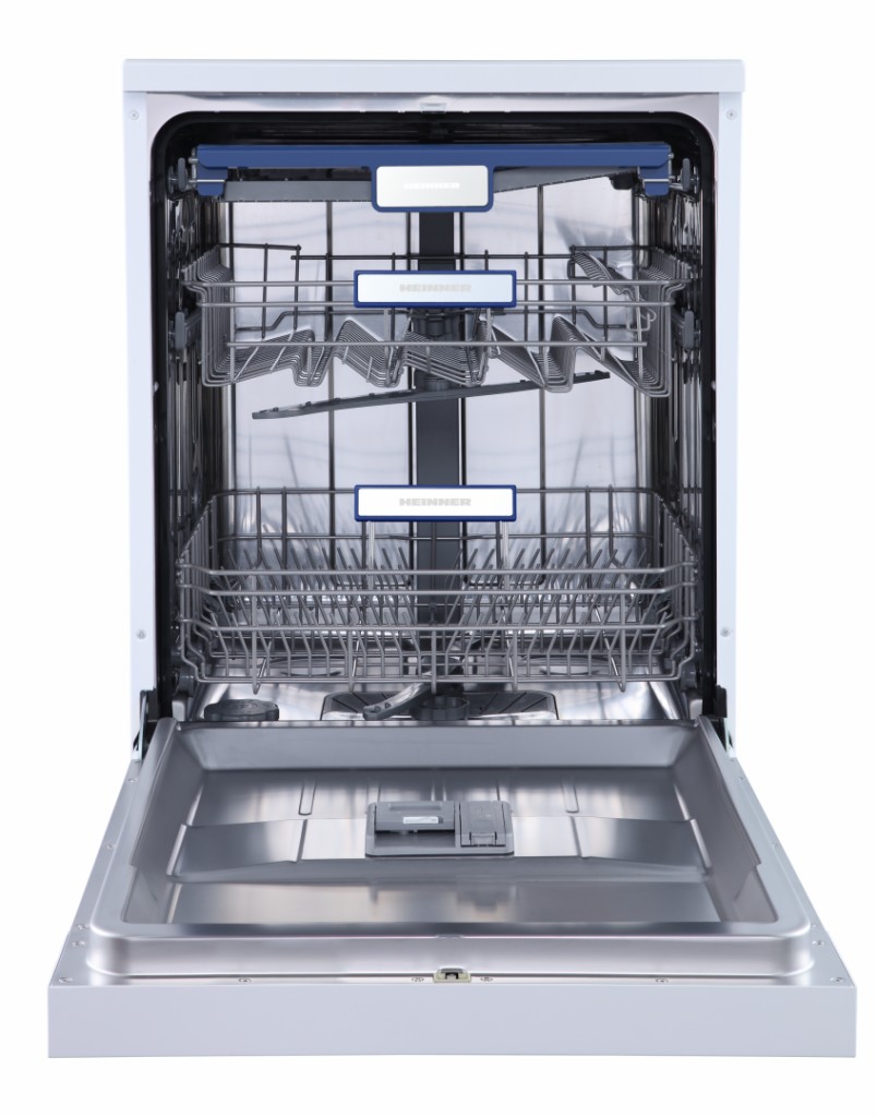 Heinner Dishwasher HDW-FSM60714AWD+++, Extraload – 14 place settings, energy class D, automatic door opening at the end of the program, electronic control, LED display, 7 washing programs, Rapid 30′ program, Auto Smart program: 55°C – 65°C, Deep Clean – Hygiene Program 70°C, 1H program, Intensive program 65°C, programmable start (1-24H), half load option on both baskets – Dual zone, intensive washing function, Extra drying function, 3 Baskets – upper cutlery basket, Flexible space – height-adjustable upper basket (loaded), lower basket: 4 foldable plate holders, child lock, flood protection – Aquastop, water consumption: 10L/wash cycle, dimensions (WxHxD): 60 x 60 x 85 cm, color: White