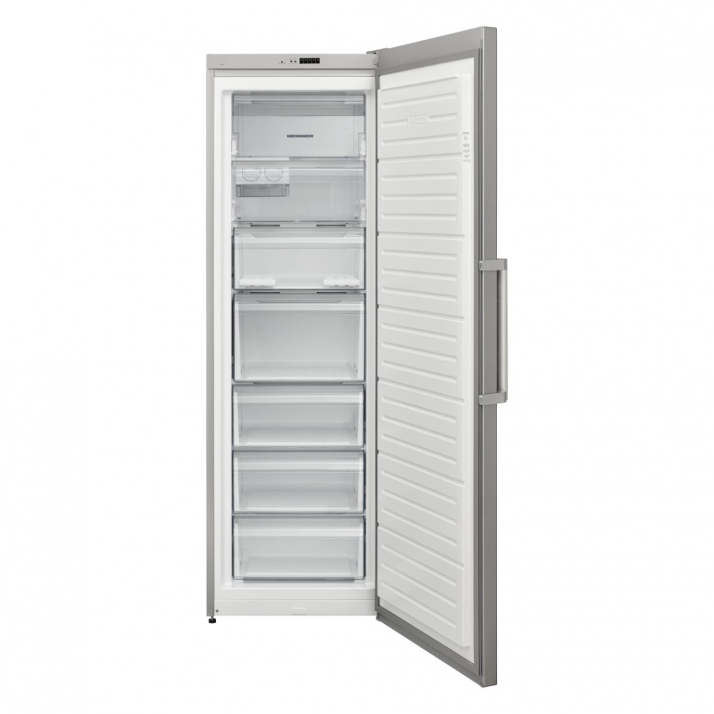 Freezer Heinner HFF-V280NFSE++, Full No Frost, energy class: E, total capacity: 280L, LED display, electronic control, “Freezer shield” technology (operates at low temperatures down to -15°C), rotating ice cube container , 7 compartments, door open alarm, reversible door, freezing capacity: 13kg/24h, dimensions: 59.5 x 65 x 186 cm, color: Silver