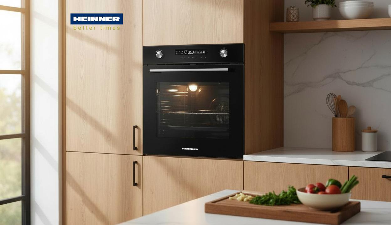HEINNER HBO-M7212GCDRP-GBK built-in oven, multifunctional, capacity 72L, 12 functions, energy class A+, digital timer, touch display, grill, ventilation assisted cooking, turbo function, pizza function, fermentation, defrost function, lighting, display lock, pyrolytic self-cleaning, removable glass, telescopic tray support, wire grill, deep tray, dimensions (WxDxH): 59.5×54.6×59.6 cm, color: black glass