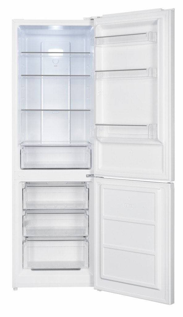 Heinner HCNF-HM293E++ refrigerator combine, No Frost, energy class E, total capacity: 293 L, refrigerator capacity: 210 L, freezer capacity: 83 L, electronic control with adjustable thermostat, LED light, 3 refrigerator glass shelves, fruit and vegetable compartment, 3 freezer drawers, reversible doors, egg holder, ice cube tray, freezing capacity: 3.8kg/24h, dimensions (LxWxH): 60 x 60 x 186 cm, color: White