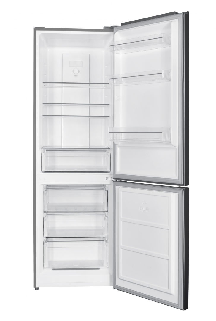 Heinner HCNF-HM293INVXE++ refrigerator combine, No Frost, Inverter compressor, total capacity: 293 L, refrigerator capacity: 210 L, freezer capacity: 83 L, energy class E, electronic control with adjustable thermostat, LED light, 3 refrigerator glass shelves, fruit and vegetable compartment, 3 freezer drawers, reversible doors, egg holder, ice cube tray, freezing capacity: 3.8kg/24h, dimensions (WxHxD): 60 x 60 x 186 cm, color: Stainless steel look
