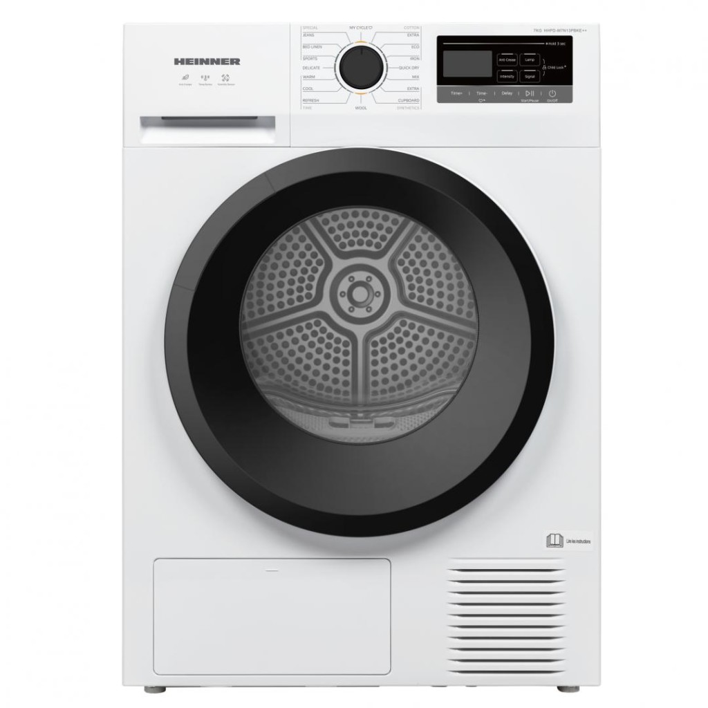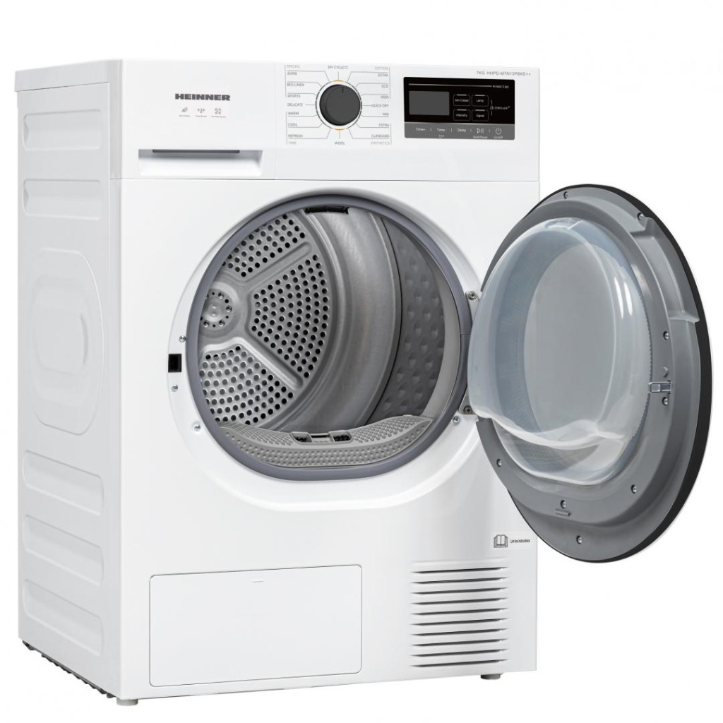 HEINNER HEAT PUMP DRYER HHPD-M7N13PBKE++, LOAD CAPACITY 7KG, ENERGY CLASS E, 16 DRYING PROGRAMS, LED DISPLAY, QUICK SHIRT PROGRAM, DELAYED START FUNCTION, ANTI-SIPHONATION FUNCTION, TUB LIGHT, DRYING LEVEL SELECTOR, LIME FILTER CLEANING INDICATOR, FULL WATER COLLECTION TANK INDICATOR, PLASTIC DOOR DOOR, CHILD ACCESS LOCK, DIMENSIONS (LXWXH): CM, COLOR: WHITE