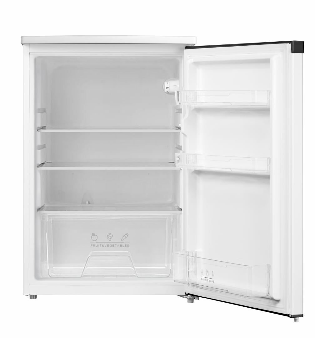 Heinner HF-M131E++ refrigerator, total capacity: 131L, energy class: E, mechanical control with adjustable thermostat, LED light, 2 glass shelves, fruit and vegetable compartment, reversible door, dimensions (WxHxD): 55.3 x 57.4 x 84.5 cm, color: White