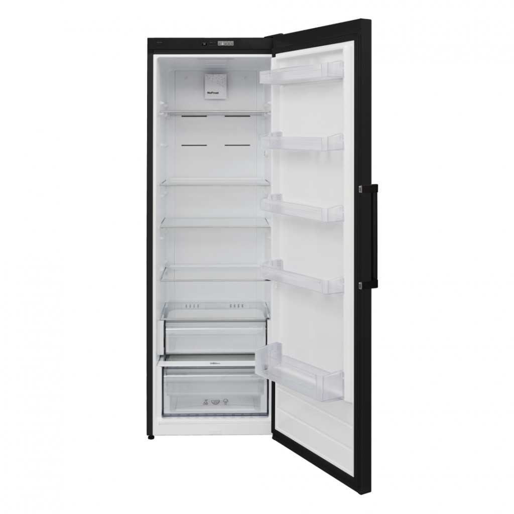 Heinner HF-V401NFBKE++ refrigerator, Full No Frost, energy class: E, total capacity: 389L, electronic control, LED light, Super cooling function, 4 glass shelves, 1 compartment for fruits and vegetables with humidity level control, Chiller compartment, egg holder , dimensions (WxDxH): 59.5 x 65 x 186 cm, color: Black