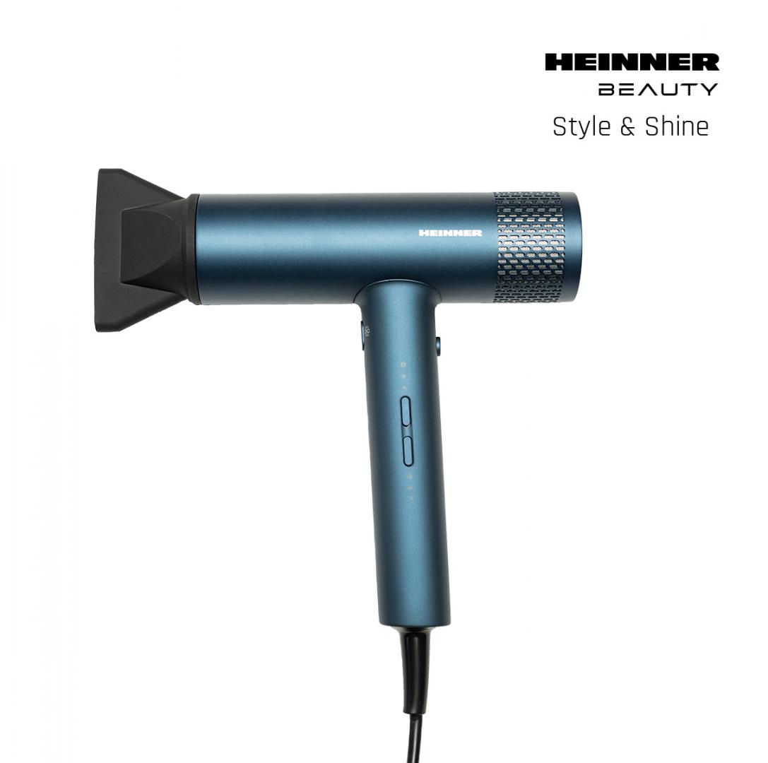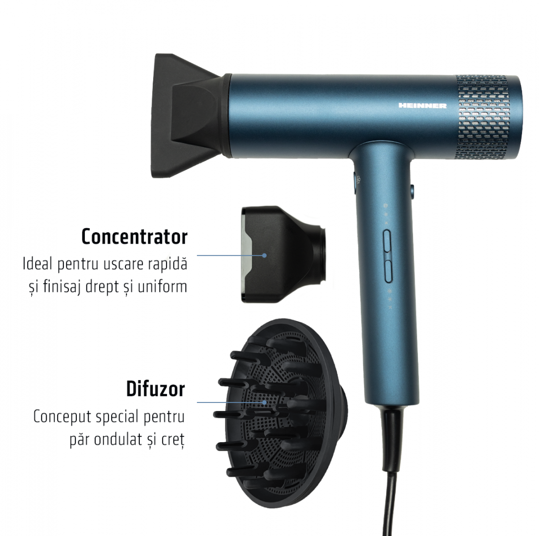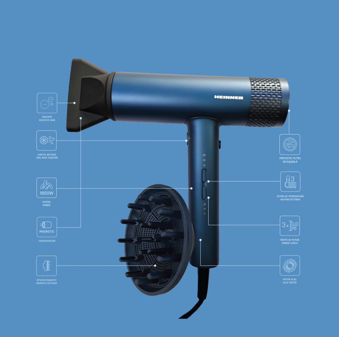 Heinner HHD-Y18BLDC-BL hair dryer, BLDC motor, power: 1800 W, 3 power levels, 3 temperature settings, ionization, cold air function, magnetic concentrator, magnetic diffuser, removable filter protection, color: blue