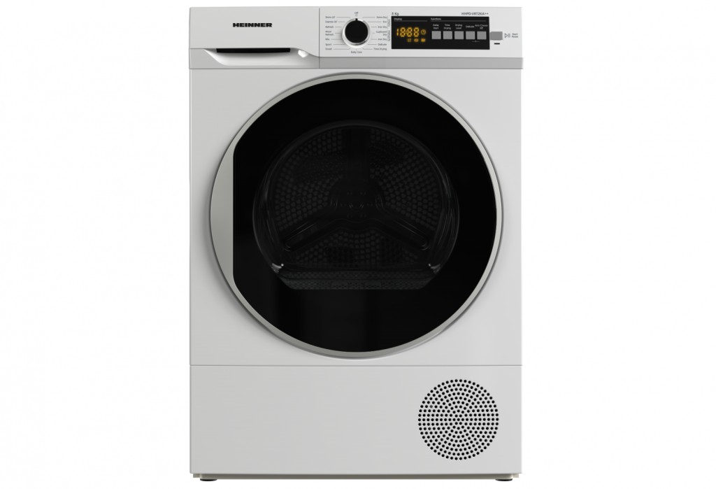 Clothes dryer with heat pump Heinner HHPD-V8T2KA++, Load capacity 8kg, Energy class A++, 15 drying programs, LED display, Quick shirt program 20 min, Express program 34 min, Baby Care program, Delayed start function, Anti- siphoning, , Pure Beam+, Reversible door, Tub light, Drying level selector, Lint filter cleaning indicator, Water collection tank full indicator, Child lock, Dimensions (WxHxD): 59.6×60.9×84.5 cm, Color: White