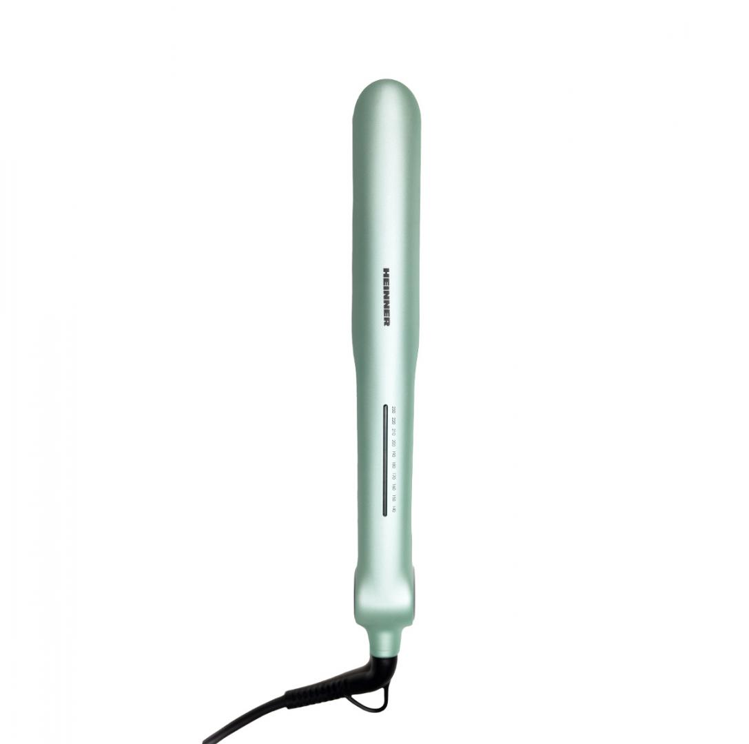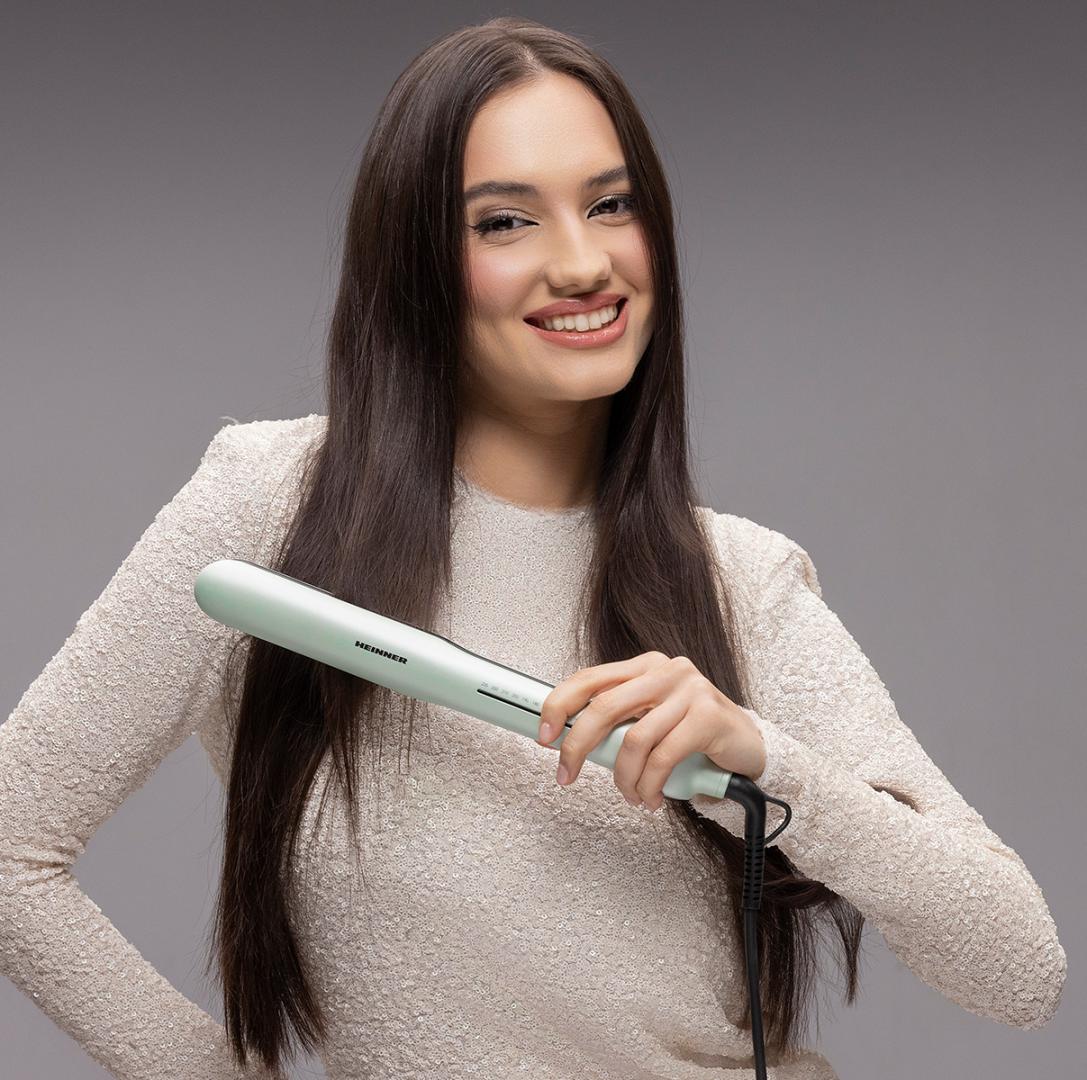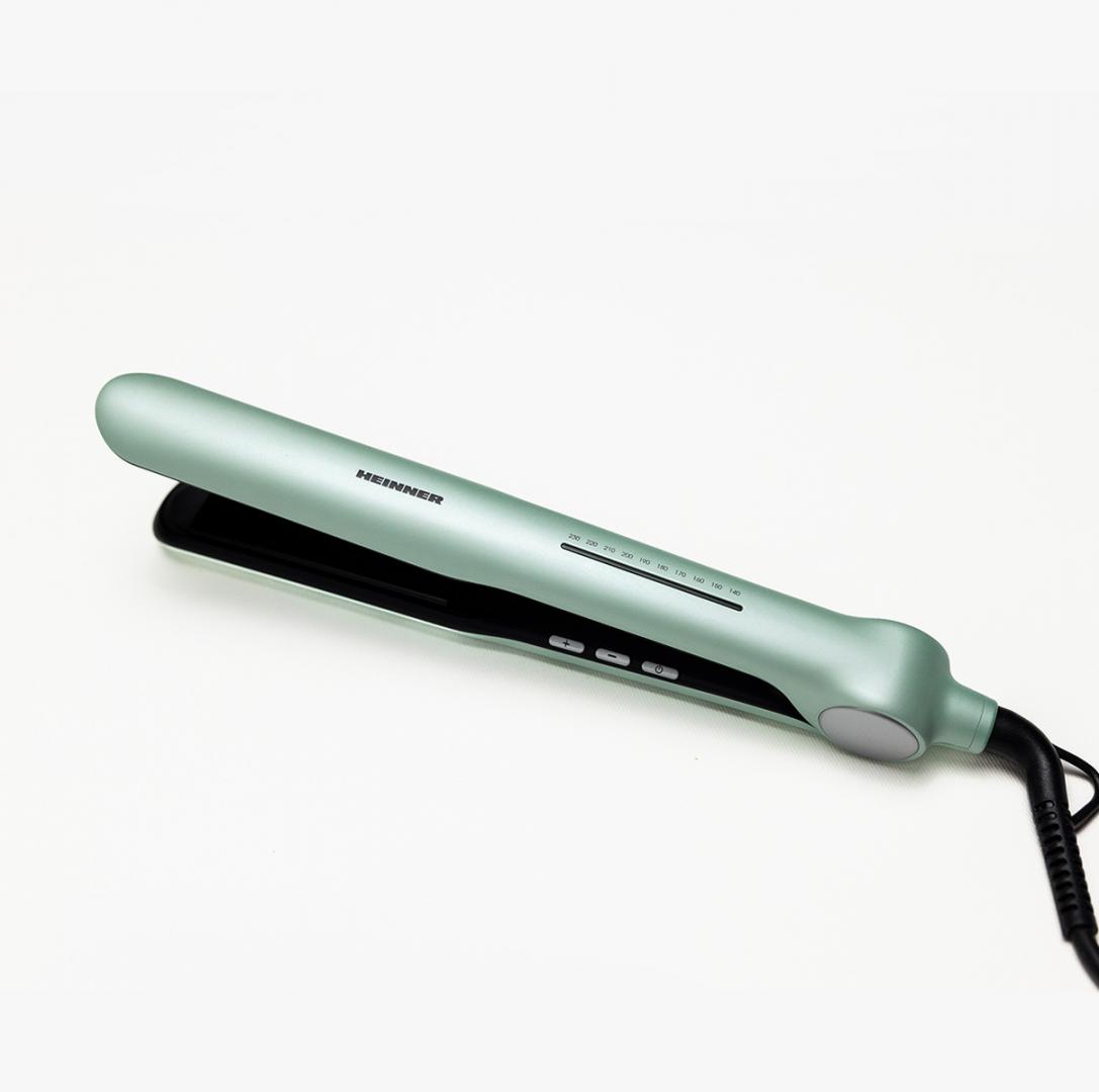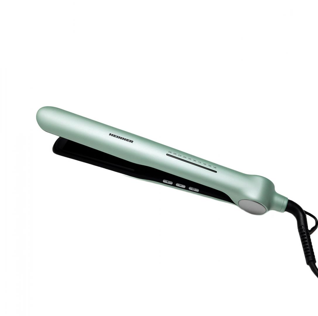 Heinner hair straightener HHS-Y230DP-GR, plasma function – reduces static and maintains hair hydration, ceramic coated plates: 25 x 105 mm, LED indicator, fast and safe heating, precise temperature control, temperature setting: 140℃ – 230℃, automatic shutdown after 1 h, plate lock function, power: 53 W, color: green