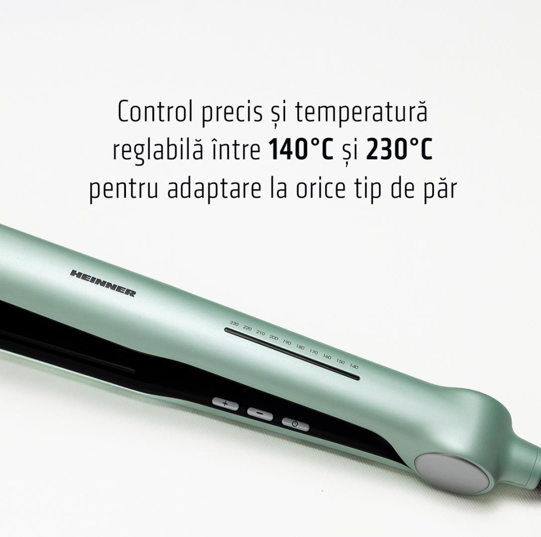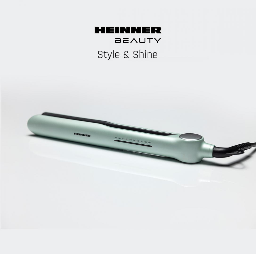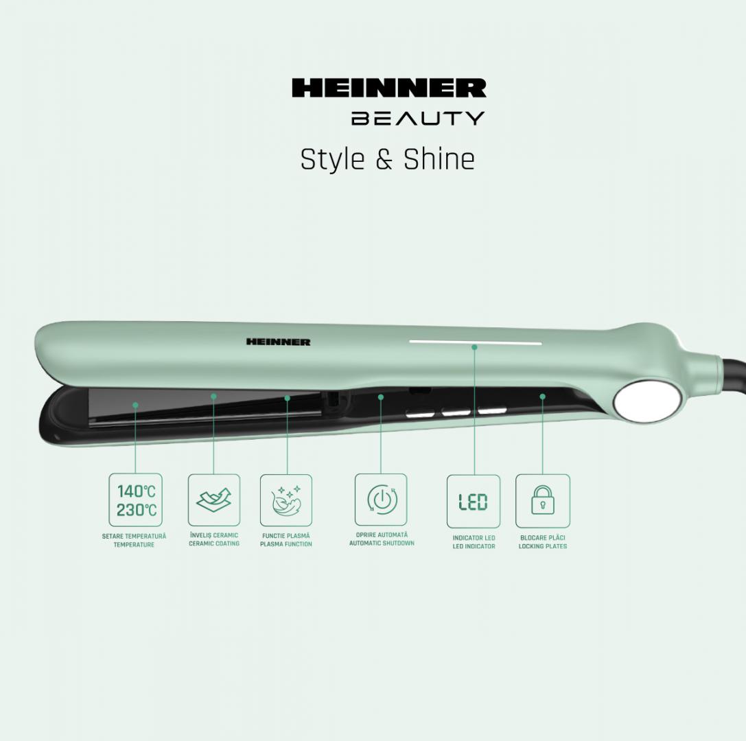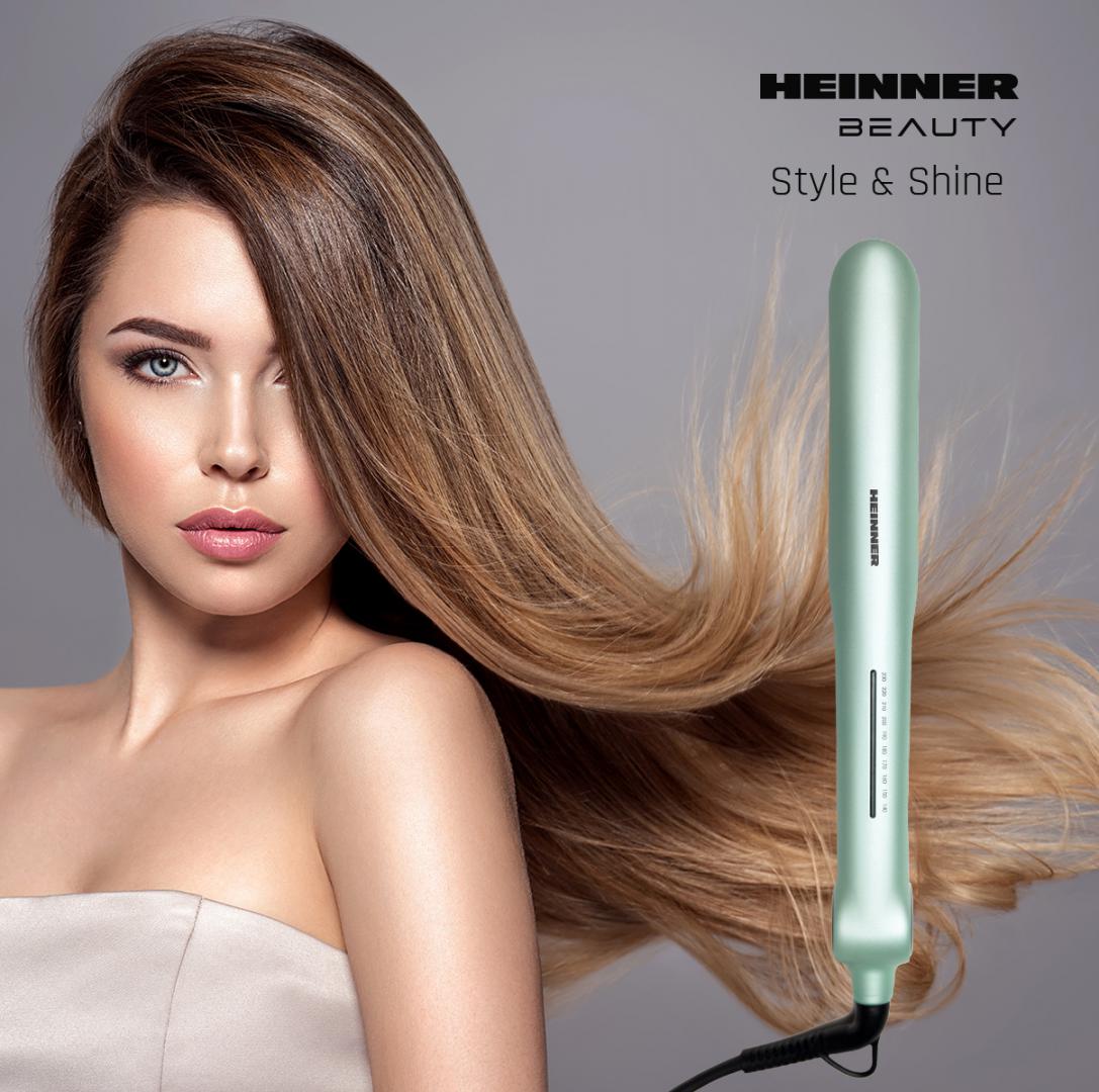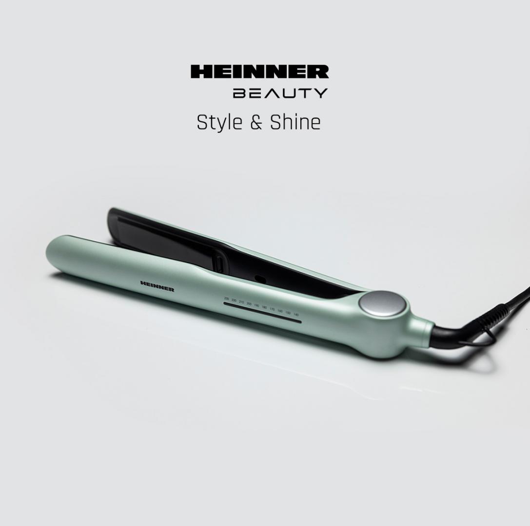 Heinner hair straightener HHS-Y230DP-GR, plasma function – reduces static and maintains hair hydration, ceramic coated plates: 25 x 105 mm, LED indicator, fast and safe heating, precise temperature control, temperature setting: 140℃ – 230℃, automatic shutdown after 1 h, plate lock function, power: 53 W, color: green
