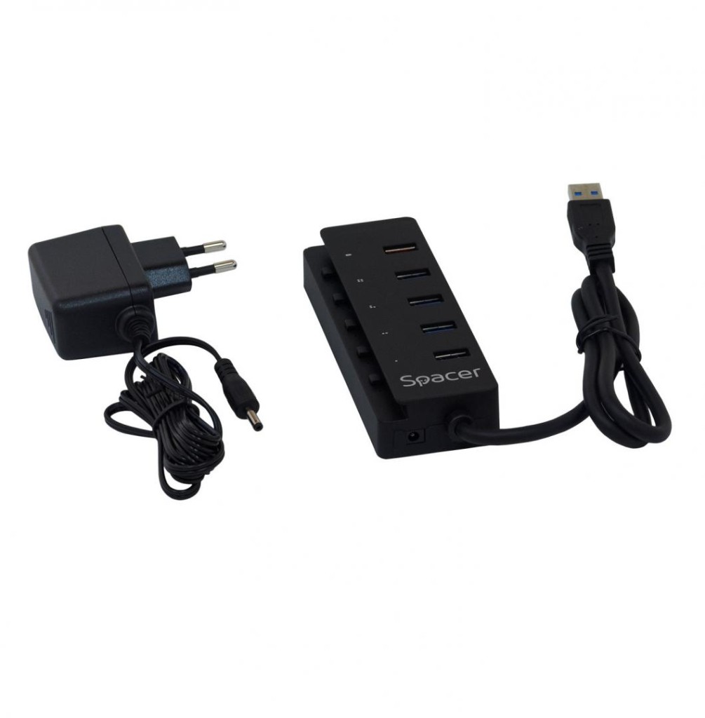 SPACER external HUB, USB ports: USB 3.0 x 4, Quick Charge USB port x 1, connection via USB 3.0, 220V mains supply, black