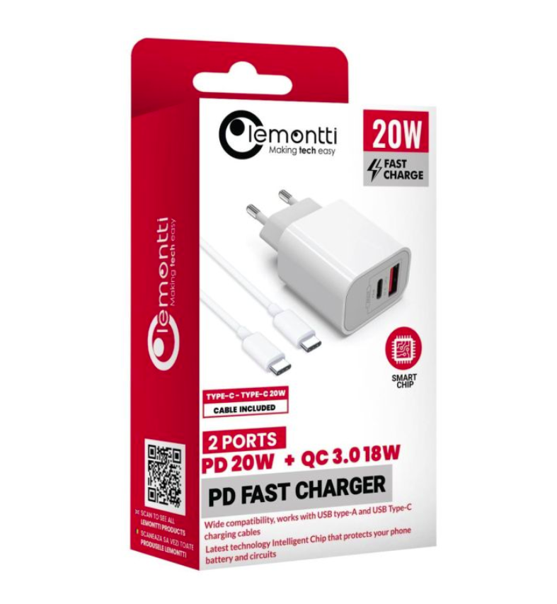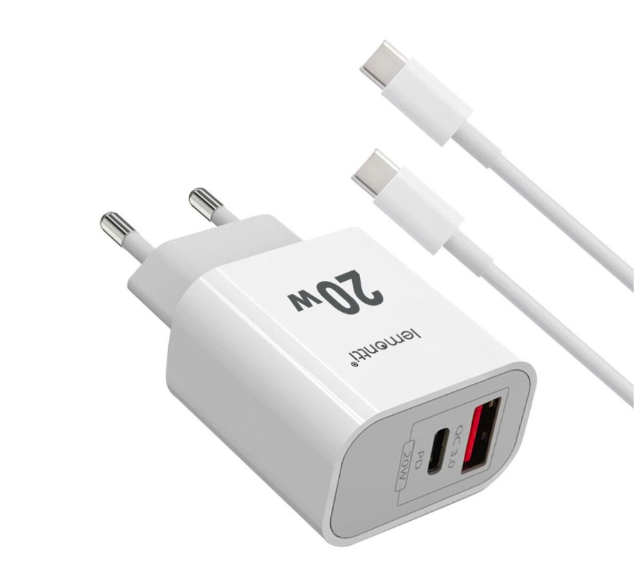 Lemontti Set Incarcator Retea Fast Charge 20W 1 x PD Type-C + 1 x USB-A Quick Charge 3.0 si cablu Type-C-Type-C 20W 1m Alb