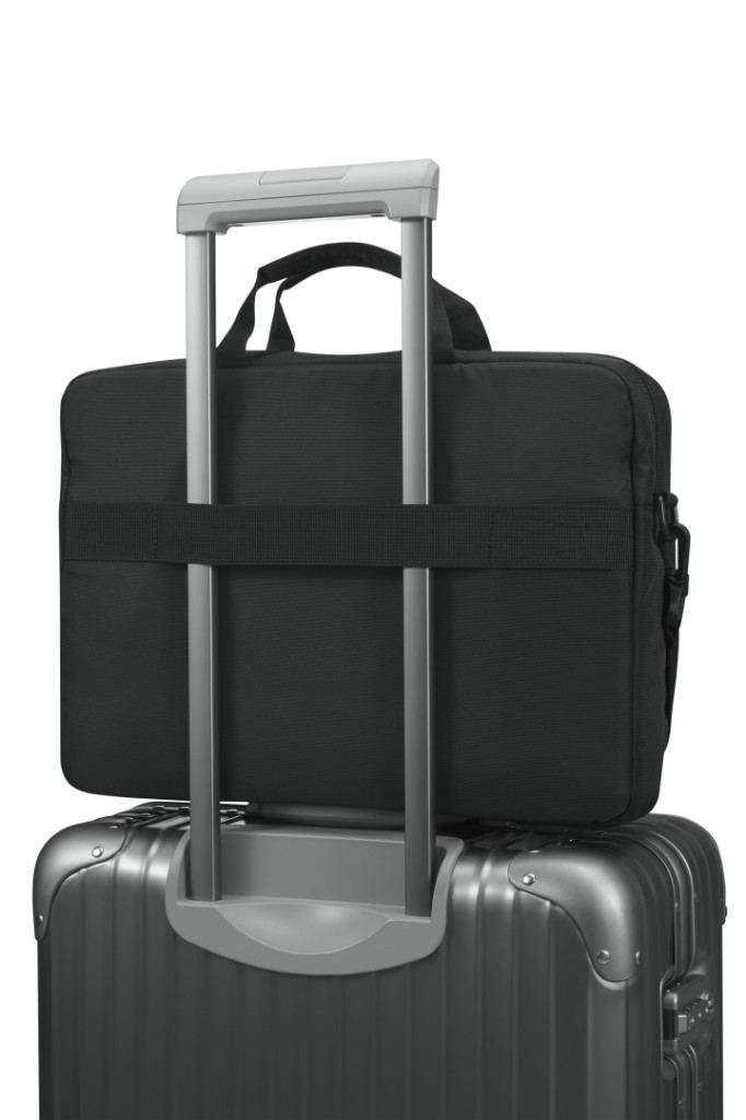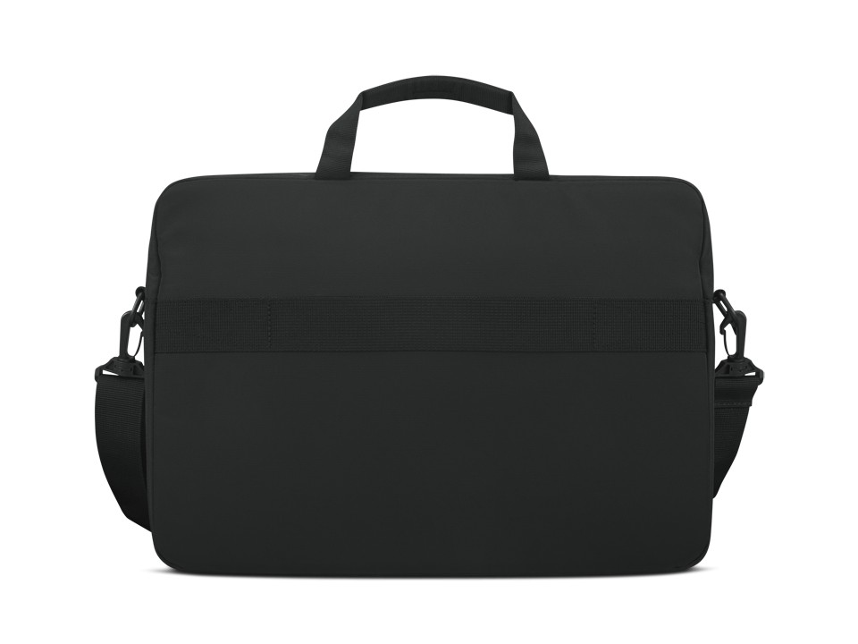 Lenovo ThinkPad Essential 16-inch Topload (Eco), Two main compartments, including a dedicated padded PC pocket, designed to fit Lenovo ThinkPad laptops up to 16″, Two additional front zip pockets for quick accessory access, Removable, adjustable shoulder strap for added comfort while carrying, Convenient luggage strap on back panel for travel and commuting, Easy-grip zippers for easy packing and unpacking, Classic black nylon exterior, grey interior lining, with splashes of classic red accents, Each bag contains the equivalent of at least two recycled plastic bottles, Polyester, RPET, PVC, Black
