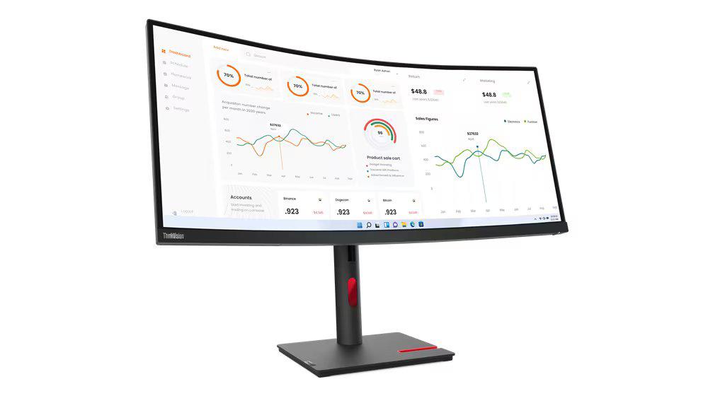 Monitor Lenovo ThinkVision T34w-30, 34″ (3440×1440) WLED, Anti-glare, Curvature: 1500R, Speakers: Modular Soundbar Support, View Angle (H / V): 178° / 178°, Response Time: 4 ms (Extreme mode) / 6 ms (Typical mode), Color Support: 16.7 Million, Refresh Rate: 60Hz, Brightness: 350 nits, Contrast Ratio: 3000:1, Stand: Tilt, Swivel, Height Adjust Stand, Case Color: Raven Black, Side Bezel Width: 2.1 mm, USB Port: 4x USB 3.2 Gen 1 (1x BC 1.2), 1x USB-C® 3.2 Gen 1 (DP 1.4 Alt Mode, USB upstream), Video Connector : 1x HDMI® 2.0, 1x DP 1.4, 1x USB-C® 3.2 Gen 1 (DP 1.4 Alt Mode), Network Connectivity: 1x RJ45, Ethernet (10M/100M/1000M), Dimensions with Stand (HxWxD): 569.3×808.4×231.6 mm, Weight (Including Stand) 9.5 kg, Base Warranty: 3-year