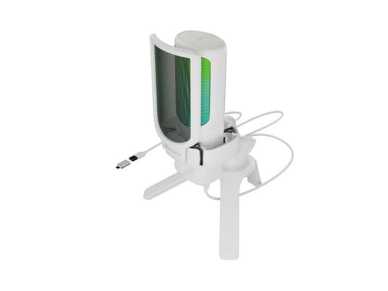 Microfon Genesis Radium 250, tip Condenser, model cardioid, suport fix, conectivitate USB-C, raspuns in frecventa 50 – 16.000 Hz, sensibilitate 40 dB, lungime cablu 200 cm, alb