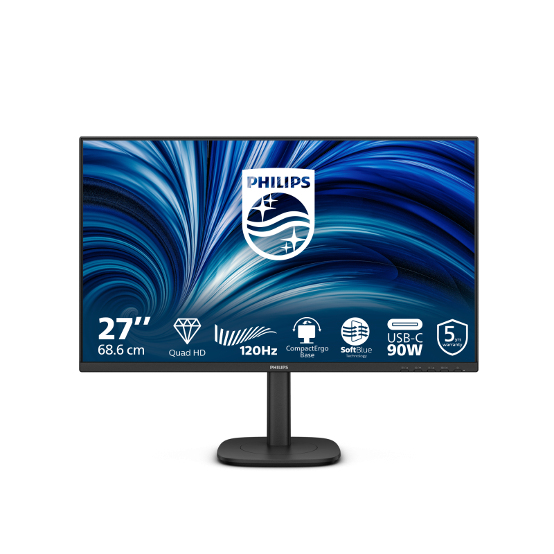 Monitor Philips 27″ 27B2U3601/00, Diagonal (inch): 27, Diagonal (cm): 68, Aspect ratio: 16:9, Panel: IPS, Resolution: 2560×1440, Refresh Rate: 120Hz, Response time GtG: 4ms, Brightness (max): 350 cd/m², Contrast (static) : 1500:1, Contrast (dynamic): 50M:1, Viewing angle: 178/178, Color Gamut Type: NTSC, Color Gamut Coverage: 1.14, Colours: 16.7M, Speakers: 2Wx2, VESA Wallmount: 100×100, Tilt: -5/+30, HAS: 150mm, Pivot: +/-90°, Swivel: -180/+180, D-SUB: 0, HDMI: x1, DisplayPort: x1, USB Hub: 1x USB 3.2 Gen 1 Type-C (Amonte), 4x USB Type-A (Aval), USB-C: x1, USB-C Power Delivery: 90W, RJ-45: Yes, AUX: x1 3.5mm Audio OUT