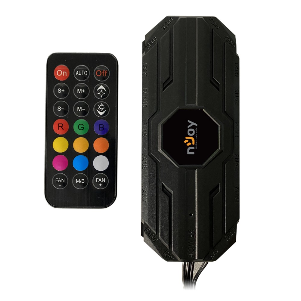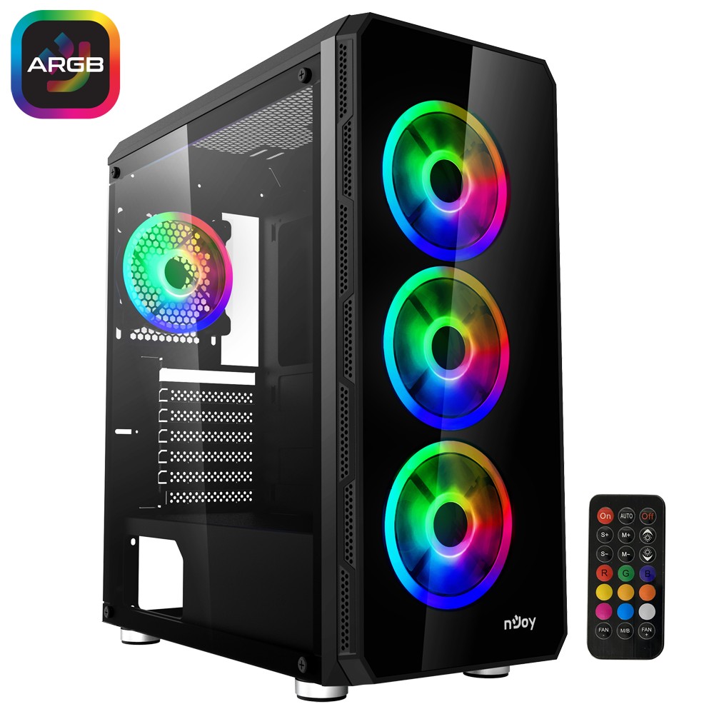 PC CASE NJOY PC ARENA; Product specs; EAN; 6422956011703; PN; CSMD-E000UAN-BL01B; Type; Middle tower ATX; Supported Motherboards; ATX & Micro ATX; Power Supply; ATX (not included); PSU Position; Down; Front Panel Finishing; Tempered Glass; Left Side Panel Finishing; Tempered Glass; Illumination Color; ARGB; USB & Sound Ports; 2 x USB 3.0 + 1 x USB 2.0 + HD Audio; Bays; 2 x 3.5” Drive Bay (Internal); 2 x 2.5” Drive Bay (Internal); Cable Management; Supported; Fans; Front: 120mm LED fan x 3 (included); Rear: 120mm LED fan x 1 (included); Top: 120mm LED fan x 2 (optional); Fan Synchronization Controller; magnetic Sync controller + remote control; Supports up to 10x fans and 2x RGB strips; Fan Speed Controller; 3 steps (Off / 50% speed / Full speed) ; Dust Filters; 1x top (magnetic, washable); 1x bottom (washable); Max VGA card; 360 mm; Max CPU Cooller; 160 mm; Other Features; 3pin 5V ARGB header connector for RGB motherboard control; Manage brightness, color effects and color speed by remote control; Supports 120mm and 240mm liquid cooling system ; Full transparent tempered glass front and side panel; Dimensions (W x H x D); 400 x 200 x 460 mm; Weight; 6.6 kgs; Package contents; PC Case; Remote controll + magnetic Sync Fan Controller; Screws ; Cable binder; https://www.njoy.global/product/arena