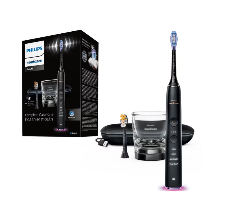 Periuta de dinti sonica electrica Philips Sonicare DiamondClean 9000 HX9917/89, 62000 miscari/minut, 4 moduri de curatare, 3 nivele intensitate, senzor presiune, functia BrushSync, 2 baze de incarcare, 2 capete de periere, aplicatie Sonicare, Negru