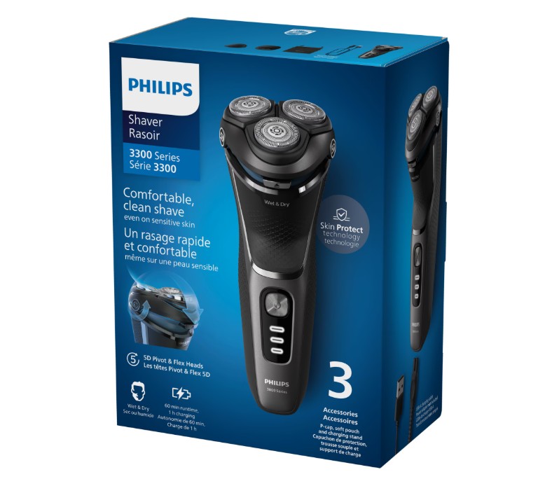 PHILIPS Shaver Series 3000 S3343/13, Wet and dry shaving, Cordless, 5D pivoting and flexible heads, Self-sharpening blades, 60 min, Anti-corrosion shaving system, Protective cap, Charging stand, Black, L x W x H (mm) 80x140x190