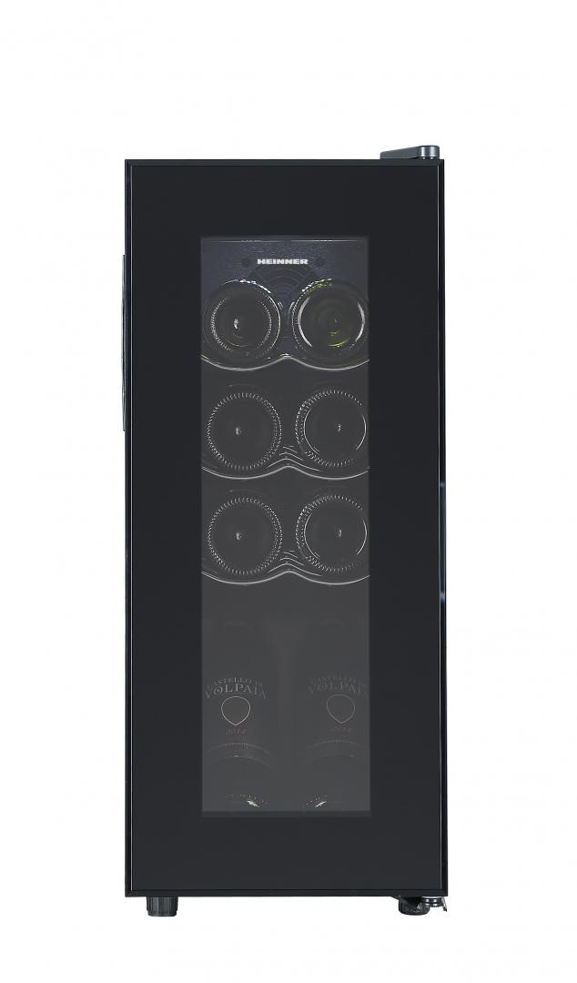 Racitor de vinuri Heinner HRV-A28DRM8, clasa energetica: G, capacitate totala: 28L, capacitate incarcare: 8 sticle (750ml), o zona de temperatura, interval de temperatura: 5~20°C, display LED, control electronic, lumina LED, 3 rafturi metalice cromate, blocare acces copii, usa reversibila, dimensiuni (LxAxI): 27 x 49 x 65.8 cm, culoare: Negru