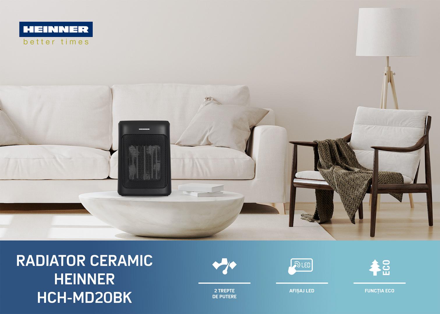 Radiator ceramic Heinner HCH-MD20BK, 2 trepte de putere: 1200W /2000W +ventilator, termostat digital cu afisaj LED, temporizator: 24h, element de încălzire ceramic (PTC), protecție împotriva răsturnării, protecție la supraîncălzire