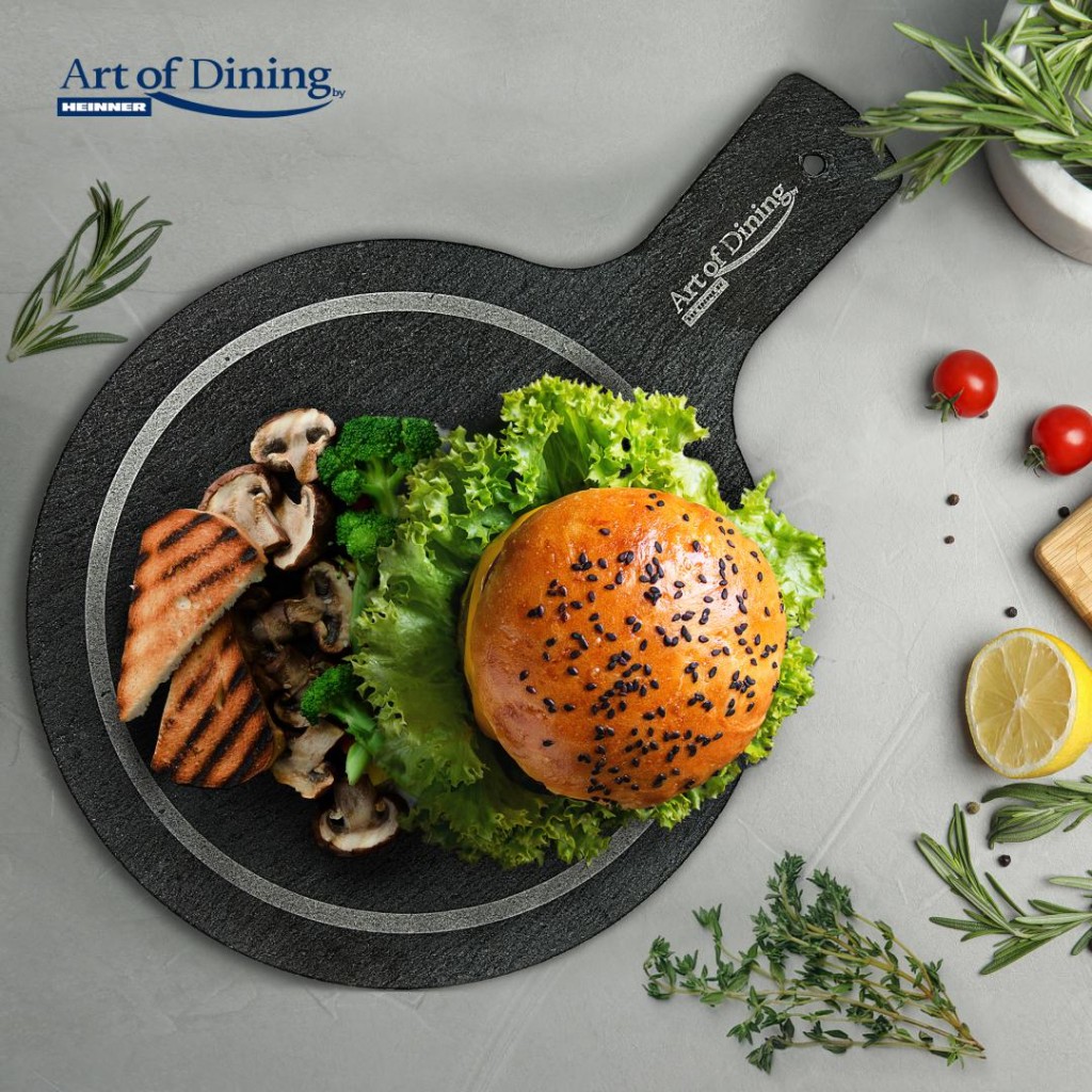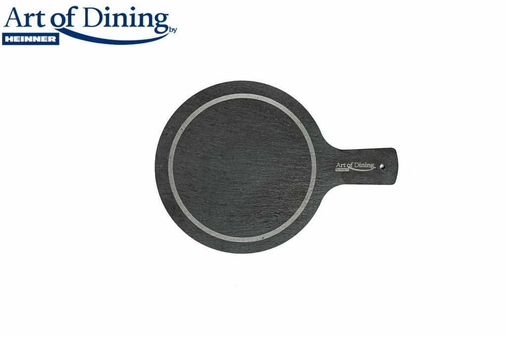 * End of Life - Backorder is not possibleSlate plate, round, with handle, 28.4×19.8cm; Dimensions: 28.4×19.8cm, handle length: 8.6cm; Thickness: 4-7mm; Weight: 640g. 437; Laser engraved Logo; 4 foam legs (EVA)
