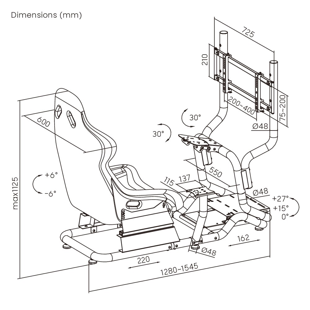 Serioux Cockpit gaming chair, dimensions: 770×1280~1545x1150mm, supported weight: 130 kg, frame material: steel, seat width: 460 mm, seat sliding range: 220 mm, seat height range: 25 mm, tilt range of seat back: +6°~-6°