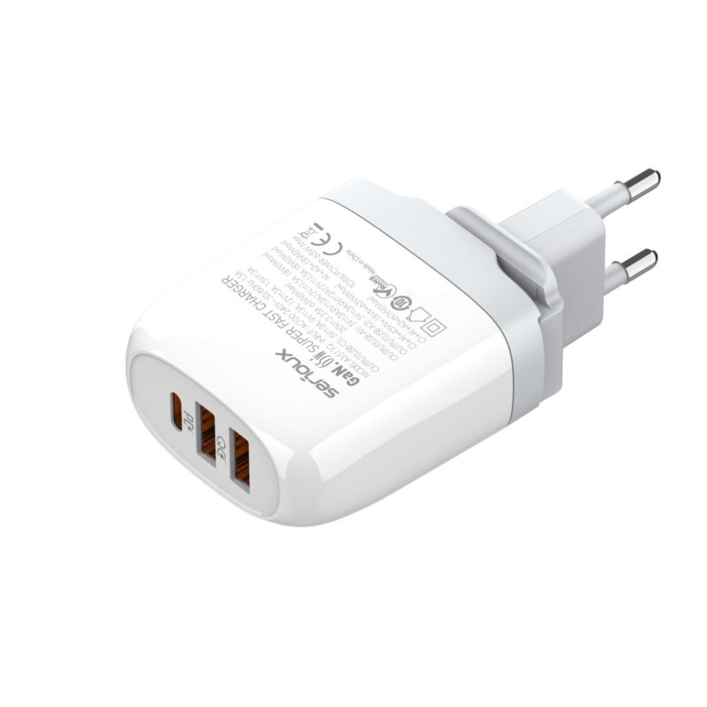 Serioux 65W GAN QC mains charger, Input: AC100-240V~ 50/60Hz 1.5A, Output (USB-C1): 5V-3A 9V-3A 12V-3A 15V-3A 20V=3.25A 65W(Max), Output (USB -A1): 5V-3A 9V-2A 12V=1.5A 18W(Max), Output (USB-A2): 5V-3A 9V-2A 12V 1.5A 18W(Max), A1+A2=18W(Max), C1 +A1=45W+18W=63W(Max), C1+A1+A2= 60W(Max), Total: 65W Max